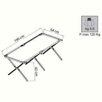 - Dati Tecnici Disponibile BLU struttura in alluminio 35 x 25 mm- 25 x 25 mm, p. max 120 kg, tessuto in oxford 600D Dimensioni: cm 190 x 64 x 42 h