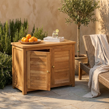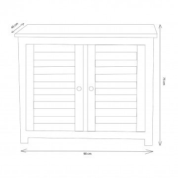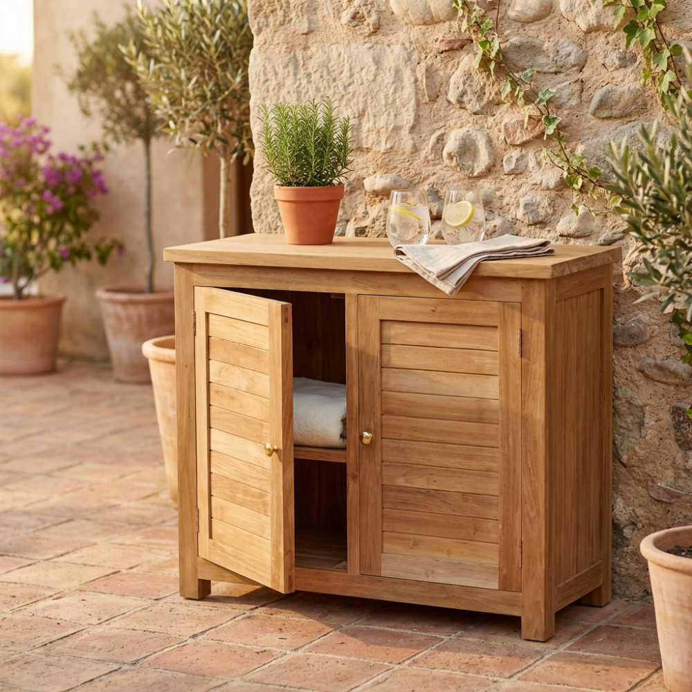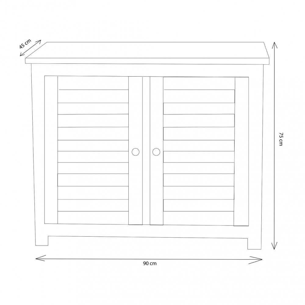 Legno Teak massiccio classe A spessore 26 mm ferramenta in lega metallo/ottone 2 ante scorrevoli e 1 ripiano all'interno Dimensioni: cm 90 x 45 x 75 h