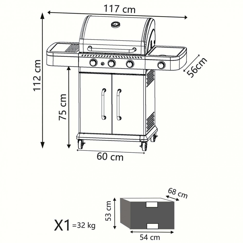 Barbecue in acciaio inox griglia di cottura in acciaio 3 F c/fornello lat- acc. Automatica 3 bruc.acciaio inox 2.7 kw, 1 bruc.lat.acciaio inox 2.5 kw Dimensioni: cm 117 x 55,5 x 112 h