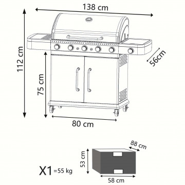 Barbecue in acciaio inox griglia di cottura in acciaio 5 F c/fornello lat- acc. Automatica 5 bruc.acciaio inox 2.7 kw, 1 bruc.lat.acciaio inox 2.5 kw Dimensioni: cm 138 x 55,5 x 112 h