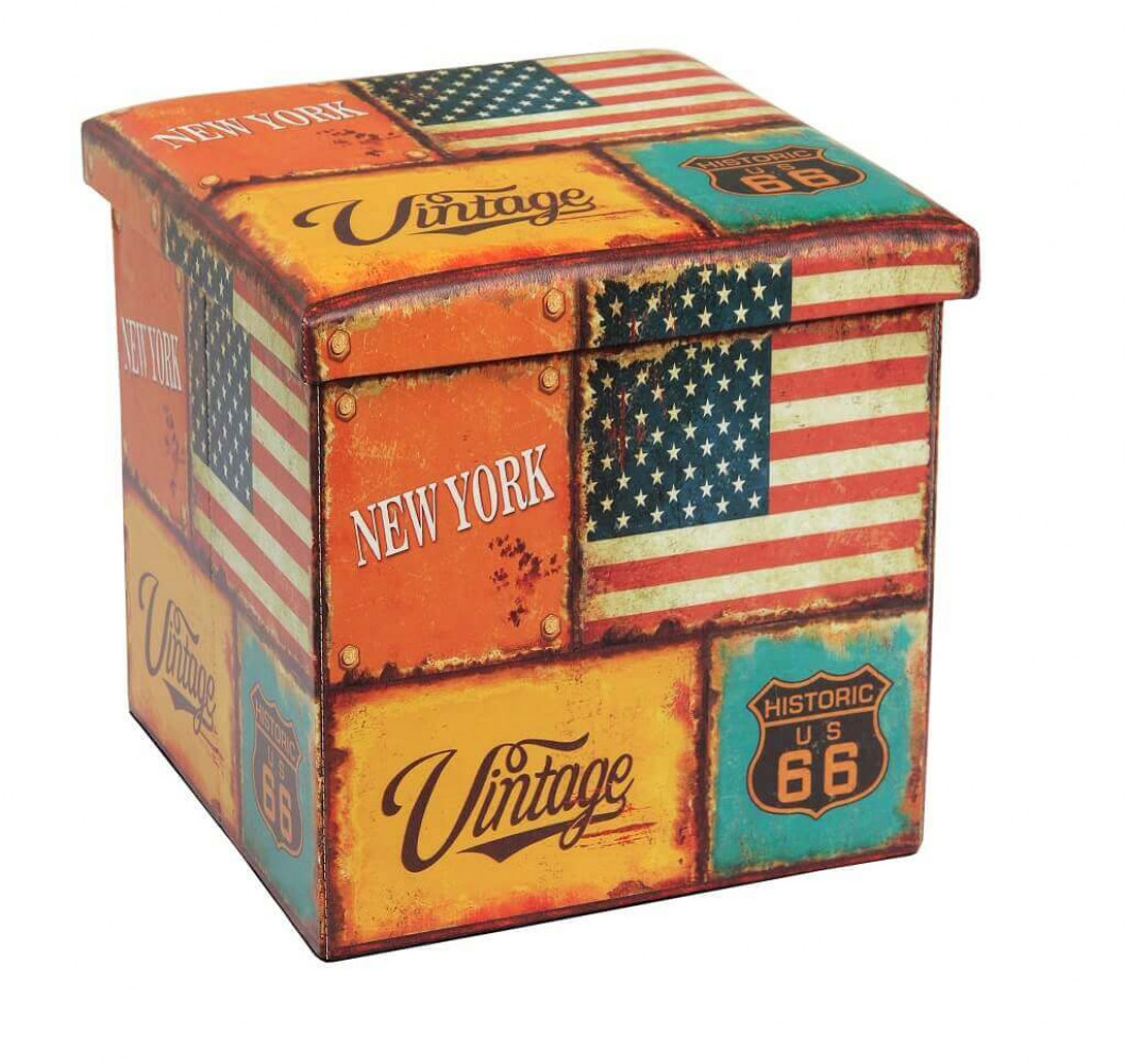 Pouf contenitore tondo, struttura in mdf e metallo, rivestimento pvc con stampa e coperchio imbottito di 3 cm Dimensioni: G.Ø30x37h/P.Ø25x30h