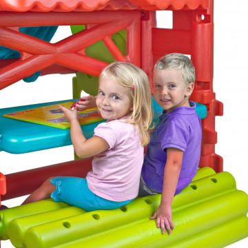 Casetta del bosco con scivolo e due scalette di salita laterali, con una panca trasformabile in contenitore per la sabbia Bambini 3+ Dimensioni: cm 200 x 125 x 139 h