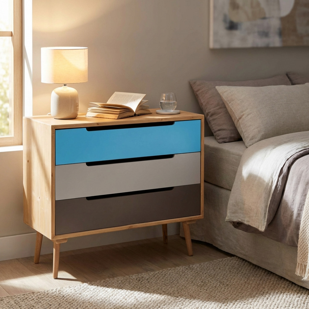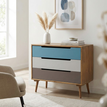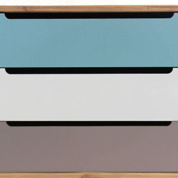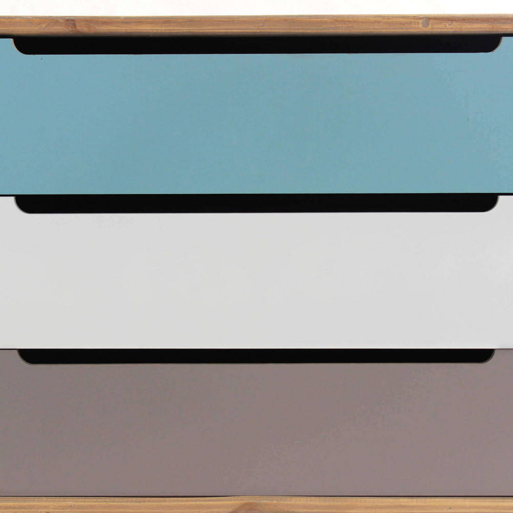- Dati Tecnici Struttura in MDF, gambe in legno di pino, top colore MARRONE 3 cassetti colorati Dimensioni: cm 80 x 35,5 x 66,5 h