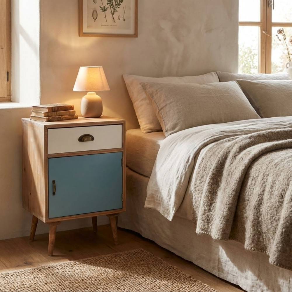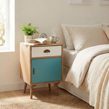- Dati Tecnici Struttura in MDF, gambe in legno di pino, top colore MARRONE anta e cassetto colorati Dimensioni: cm 40 x 36,5 x 64 h