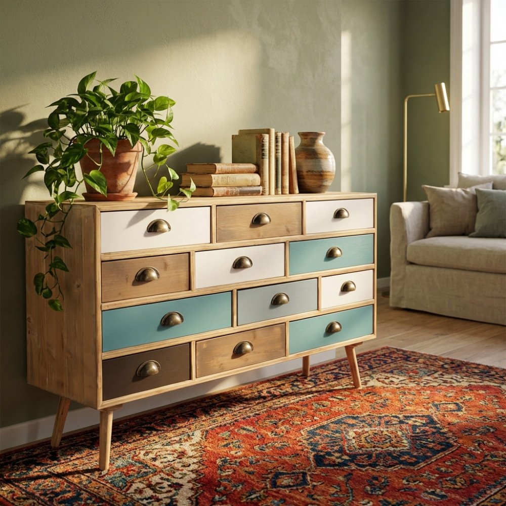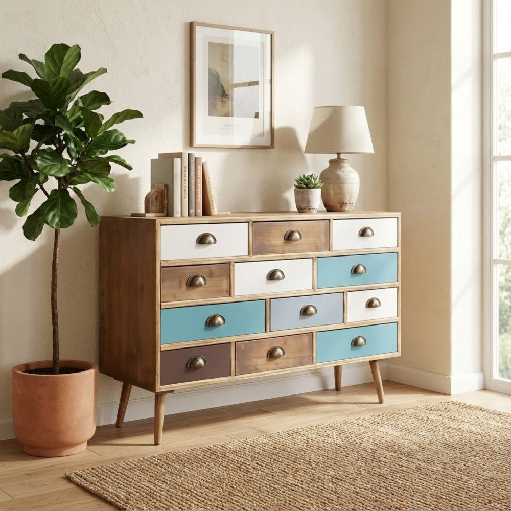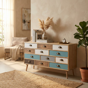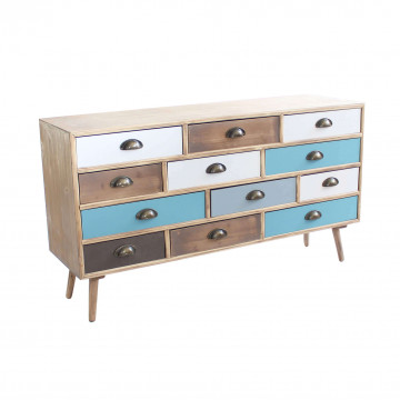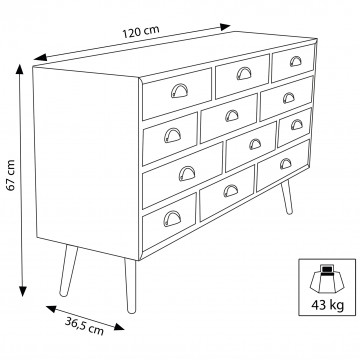 - Dati Tecnici Struttura in MDF, gambe in legno di pino, top colore NATURALE 12 cassetti colorati Dimensioni: cm 120 x 36,5 x 67 h