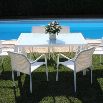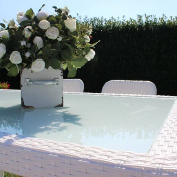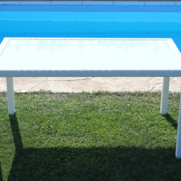 - Dati Tecnici Struttura in metallo, wicker MARRONE, GRIGIO o BIANCO materiale UV protection piano in vetro spessore 5 mm Dimensioni: cm 150 x 90