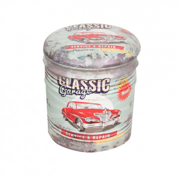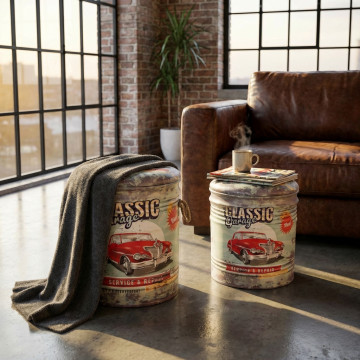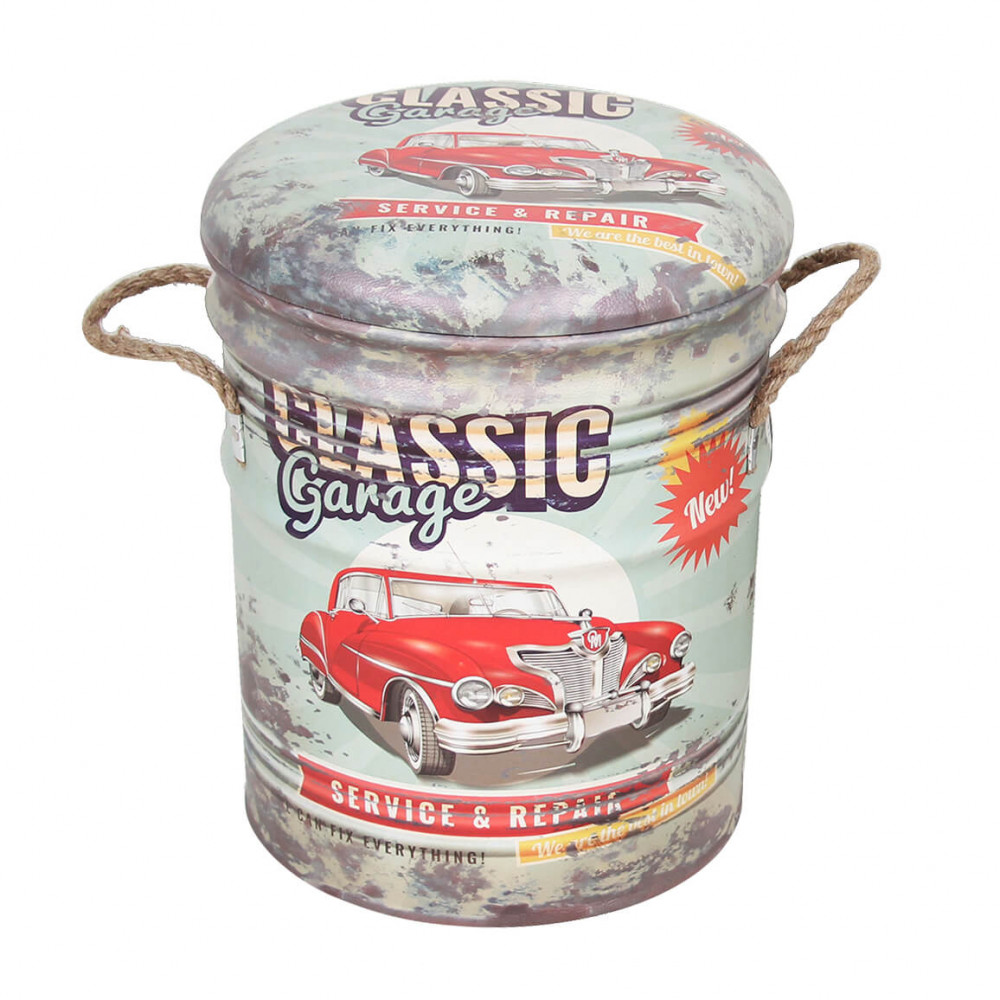 Pouf contenitore tondo, struttura in mdf e metallo, rivestimento pvc con stampa e coperchio imbottito Dimensioni: G.Ø30x38h/P.Ø27,5x31h