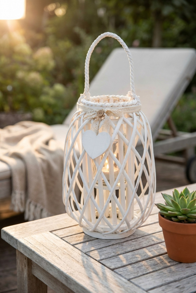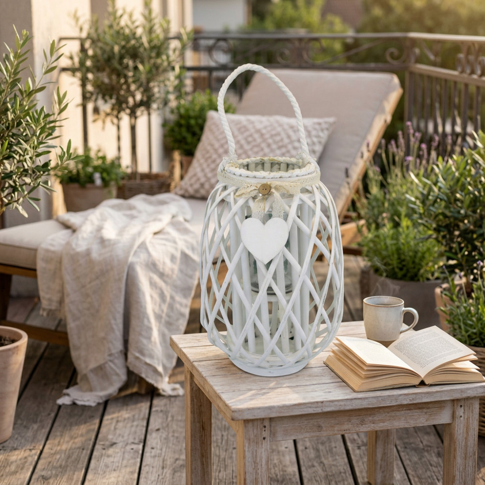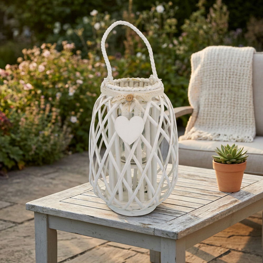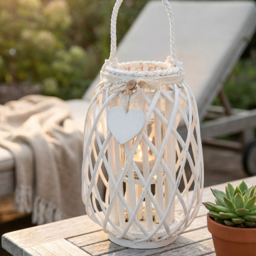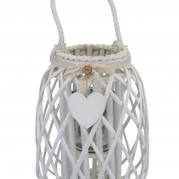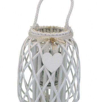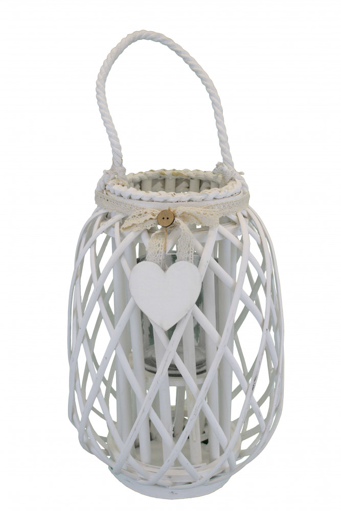 Lanterna BIANCA in vimini e vetro con nastro in pizzo e decoro a cuore Dimensioni: cm Top Ø 14 x 35 h-Centrale Ø 24 x 35 h-Vetro Ø 10 x 12 h