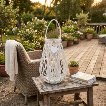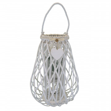 Lanterna BIANCA in vimini e vetro con nastro in pizzo e decoro a cuore Dimensioni: cm Top Ø 18 x 53 h-Centrale Ø 36 x 53 h-Vetro Ø 13 x 17 h
