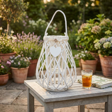 Lanterna BIANCA in vimini e vetro con nastro in pizzo e decoro a cuore Dimensioni: cm Top Ø 16 x 46 h-Centrale Ø 33 x 46 h-Vetro Ø 12 x 12 h