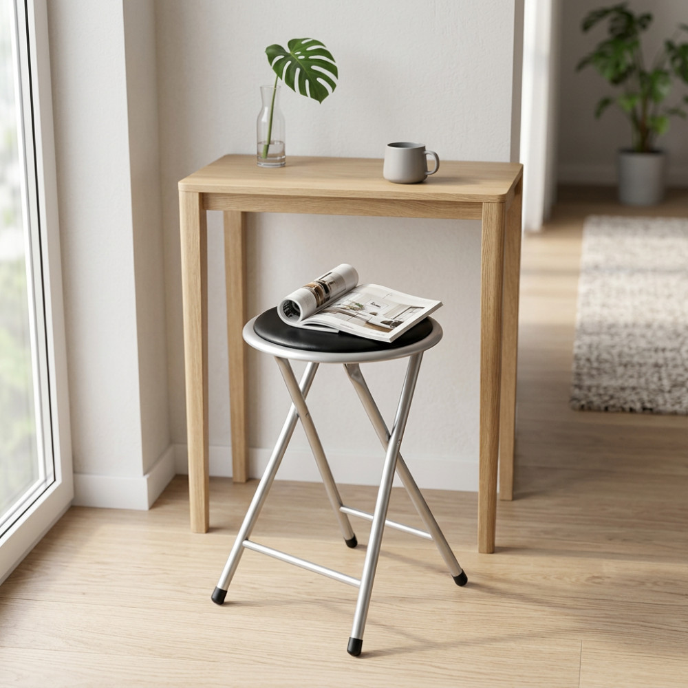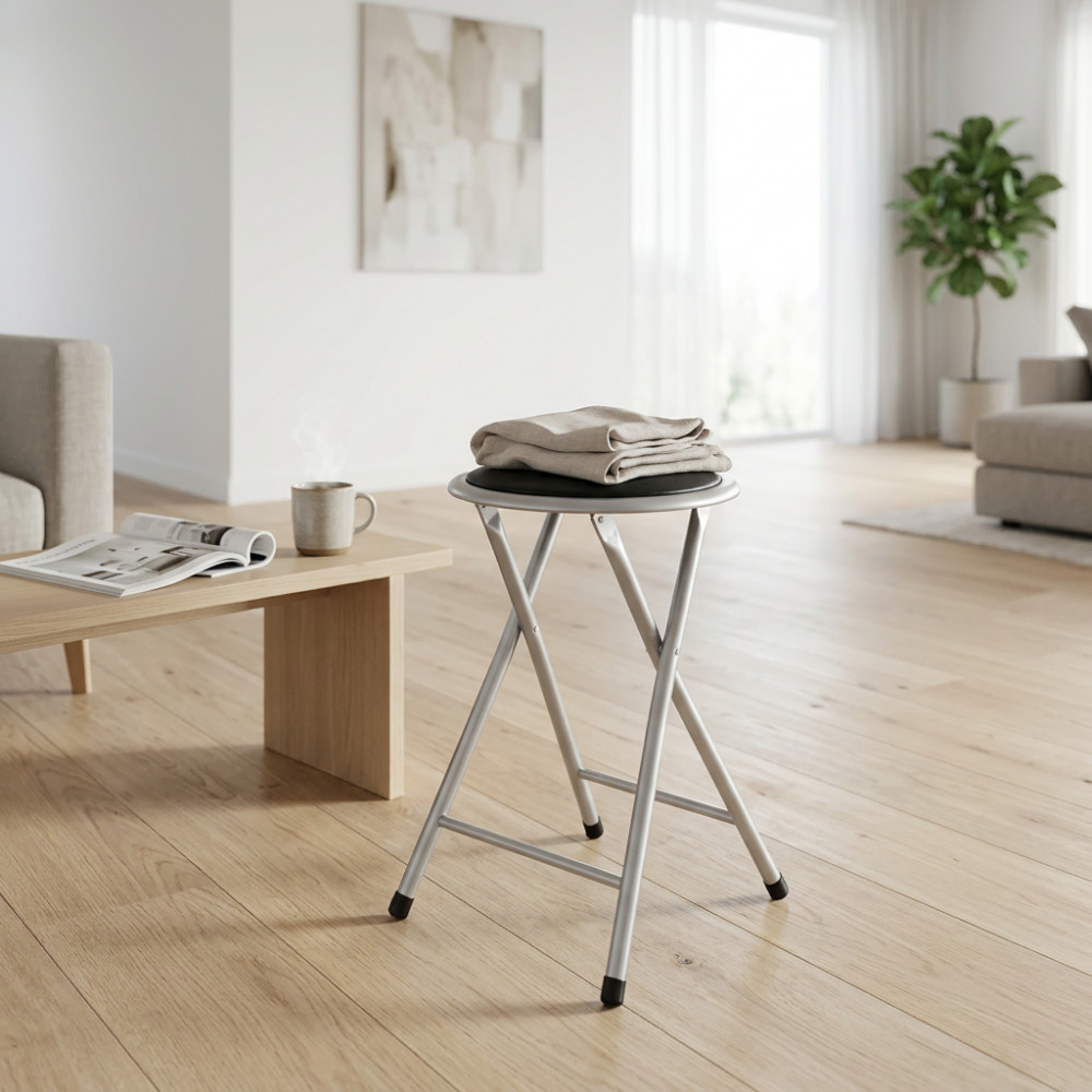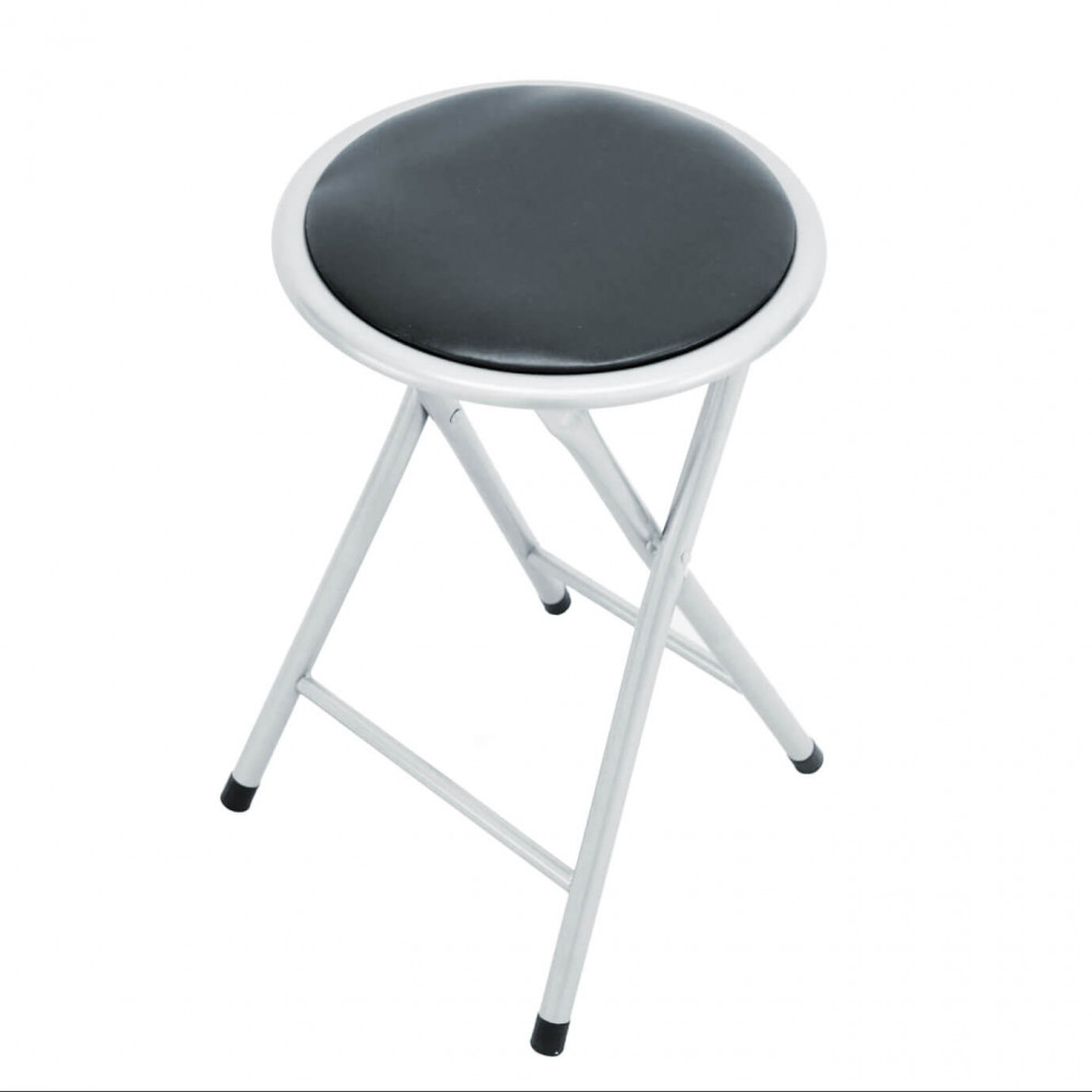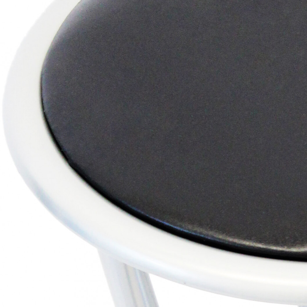 - Dati Tecnici Sgabello pieghevole con seduta imbottita in PVC tubo verniciato GRIGIO: Ø19 x 0,8 mm Dimensioni: cm Ø 30 x 45 h