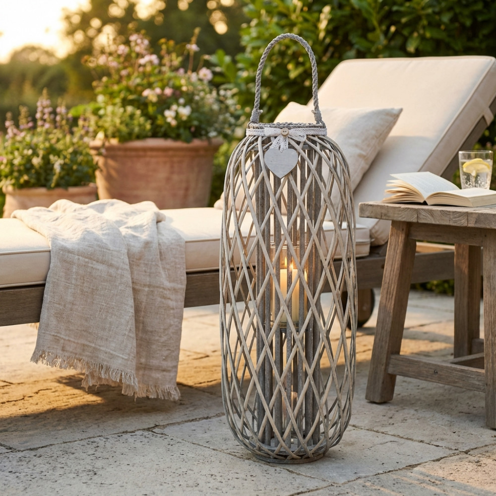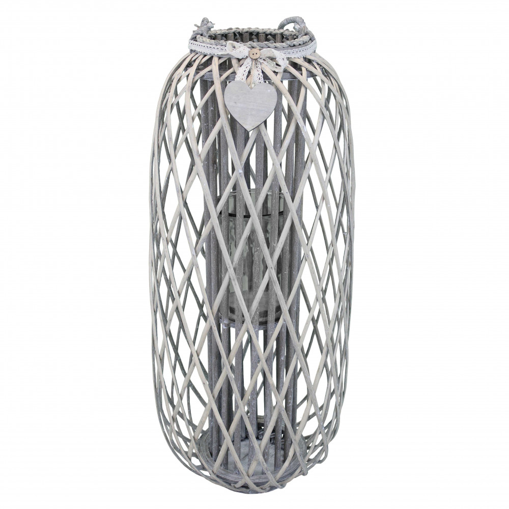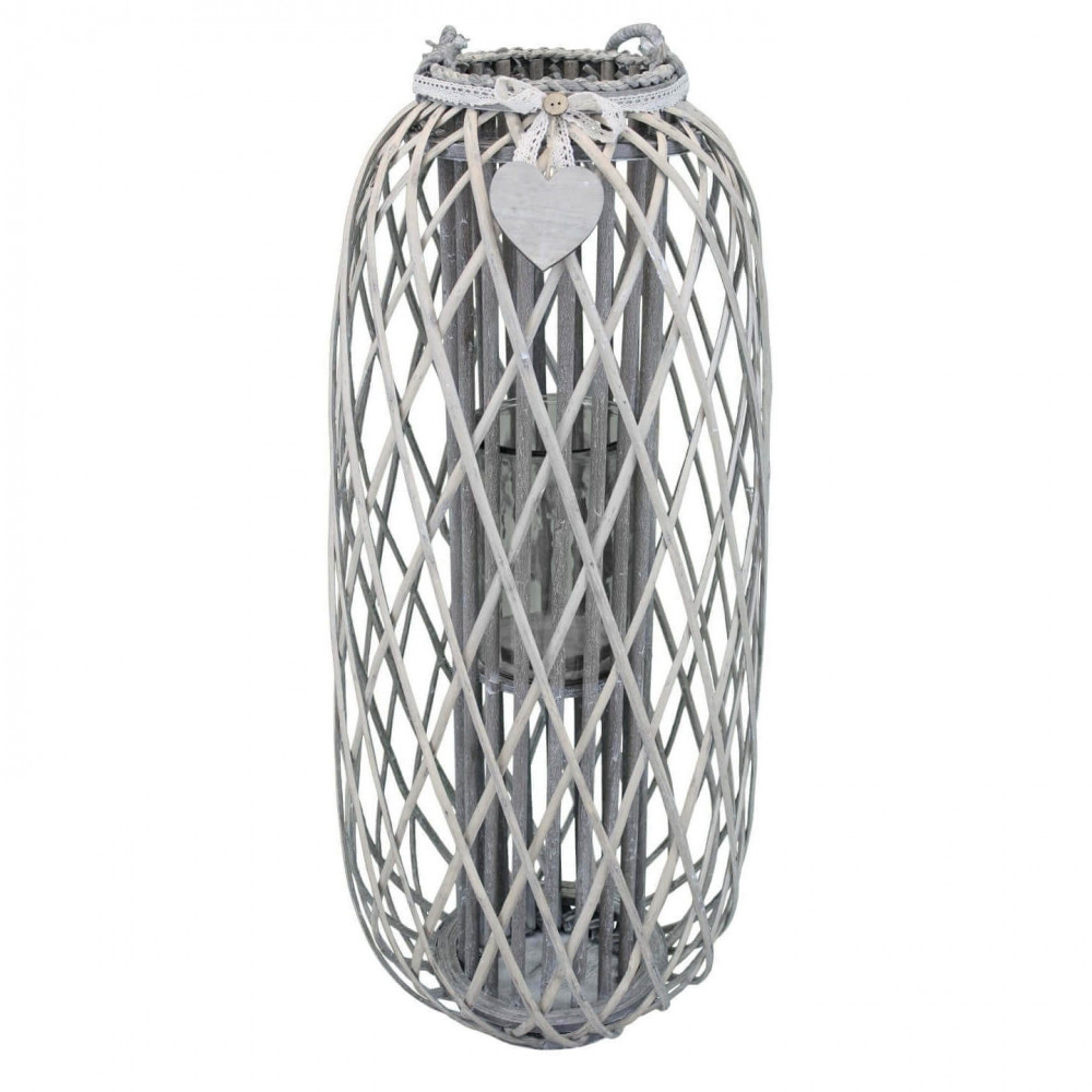 Lanterna GRIGIA in vimini e vetro con nastro in pizzo e decoro a cuore Dimensioni: cm Top Ø 20 x 95 h-Centrale Ø 39 x 95 h-Vetro Ø 15 x 21 h