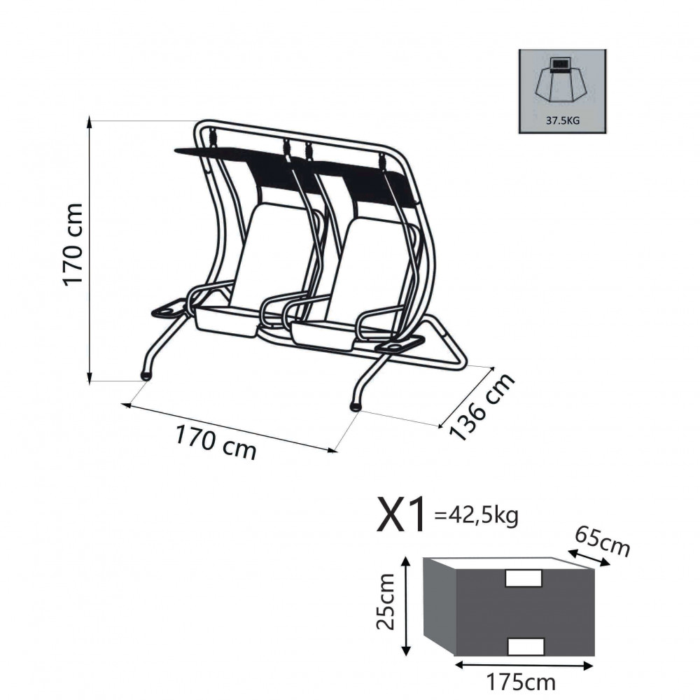 Struttura NERA telo 180 gr telo poliestere TORTORA tubi in metallo Ø 48 x 1,2 mm tessuto 300x600 gr oxford TORTORA con sedute separate Dimensioni: cm 170 x 136 x 170 h