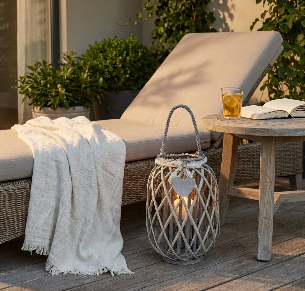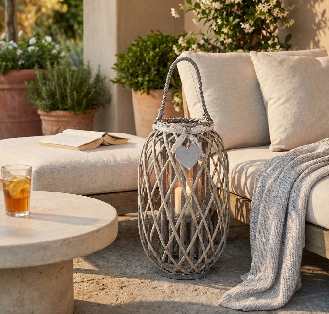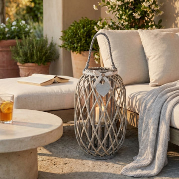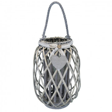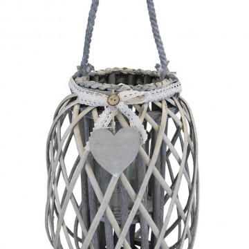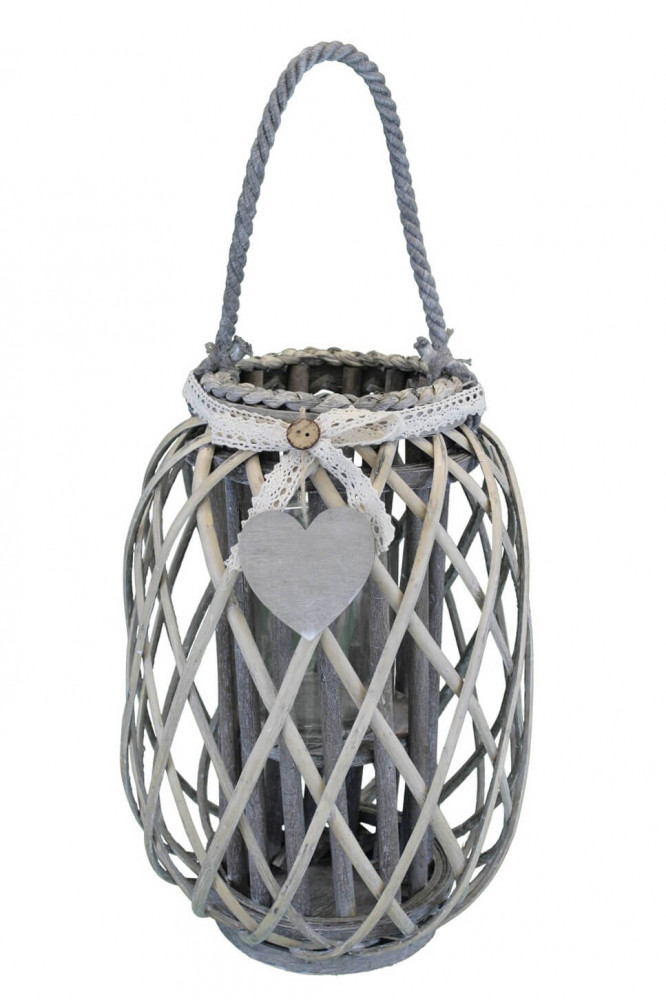 Lanterna GRIGIA in vimini e vetro con nastro in pizzo e decoro a cuore Dimensioni: cm Top Ø 15 x 66 h-Centrale Ø 30 x 56 h-Vetro Ø 12 x 12 h