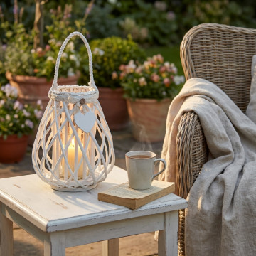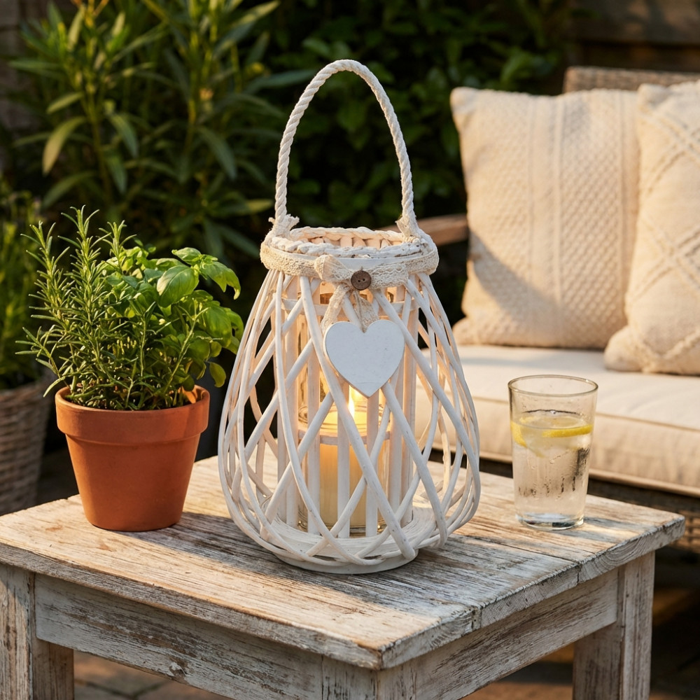 Lanterna BIANCA in vimini e vetro con nastro in pizzo e decoro a cuore Dimensioni: cm Top Ø 13 x 30 h-Centrale Ø 26 x 30 h-Vetro Ø 10 x 12 h