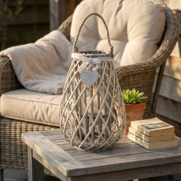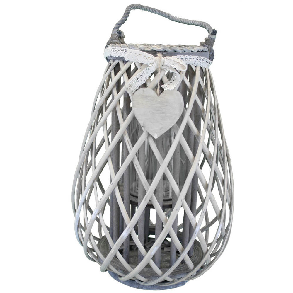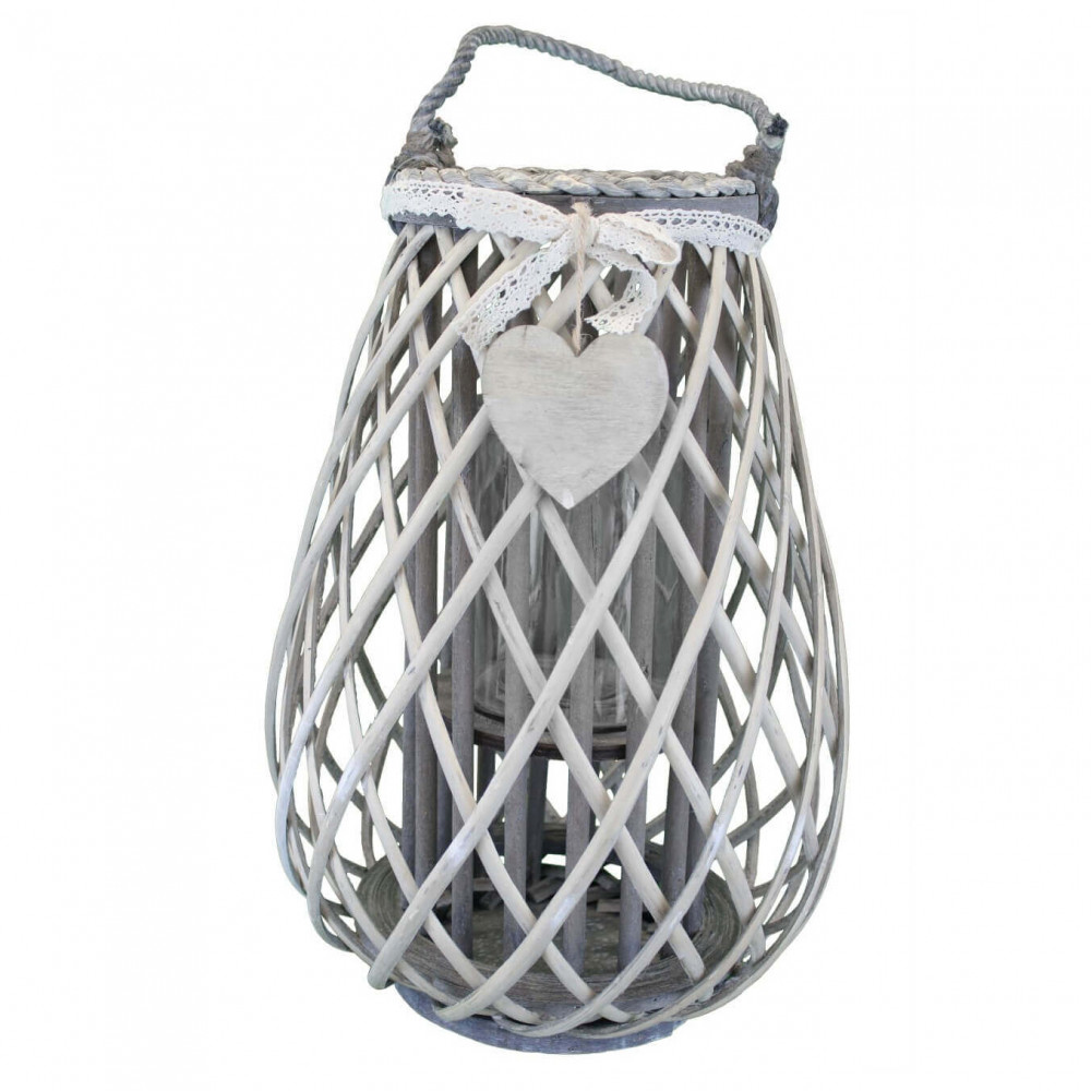 Lanterna GRIGIA in vimini e vetro con nastro in pizzo e decoro a cuore Dimensioni: cm Top Ø 17 x 41 h-Centrale Ø 30 x 41 h-Vetro Ø 12,5 x 15 h