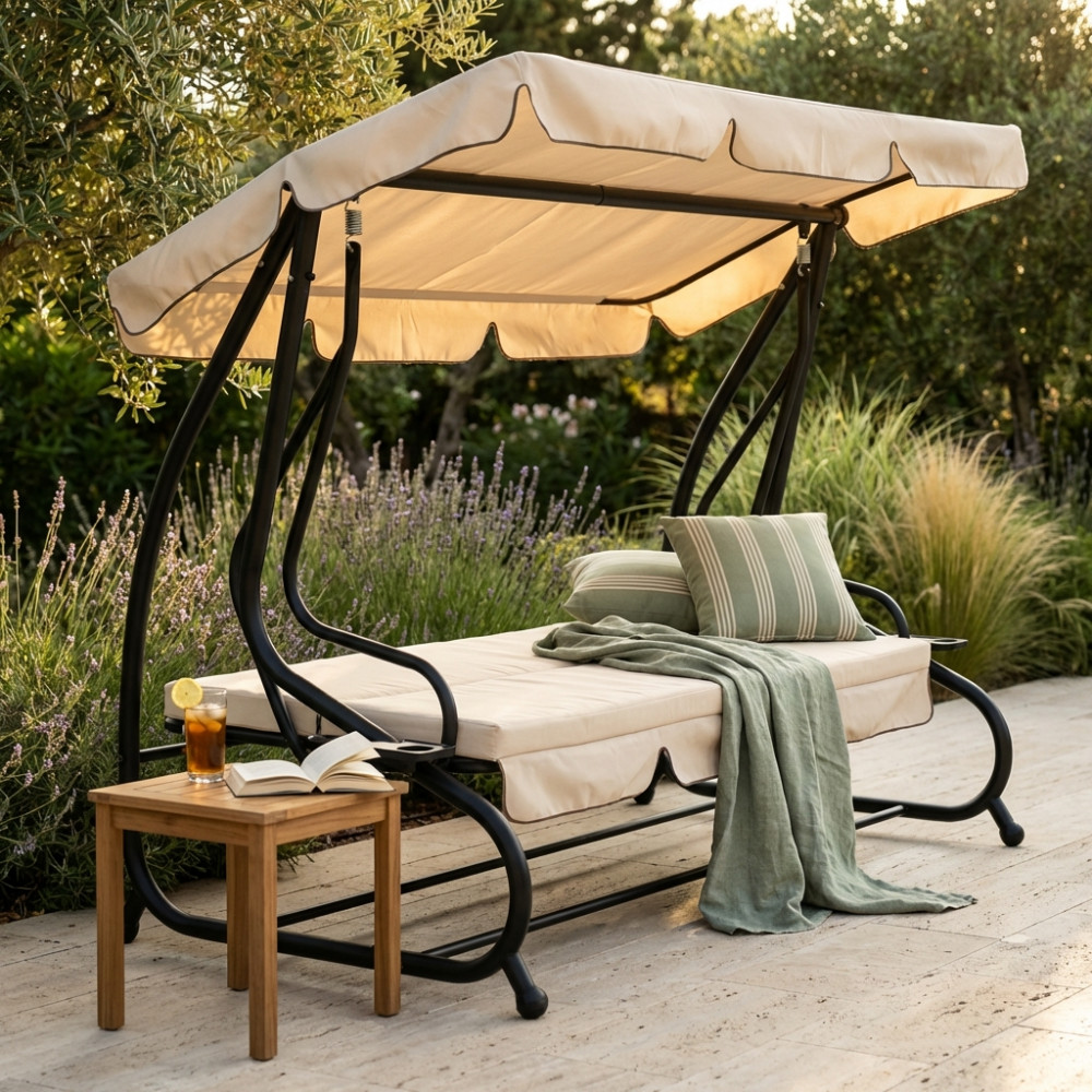 Telo poliestere 180 gr BEIGE, cuscino BEIGE oxford spessore 8 cm struttura in metallo nero tubi Ø 48/32/28/16 mm portata massima 260 kg Dimensioni: cm 230 x 120 x 164 h