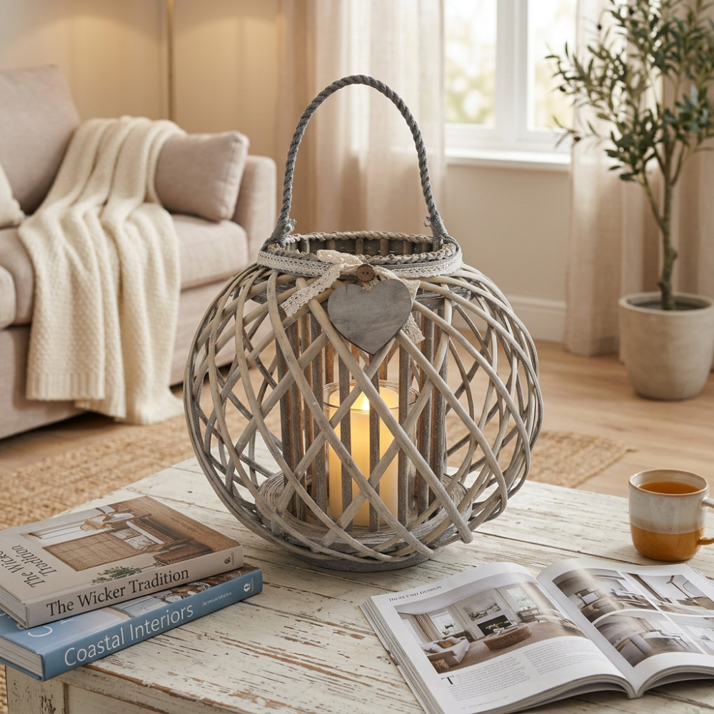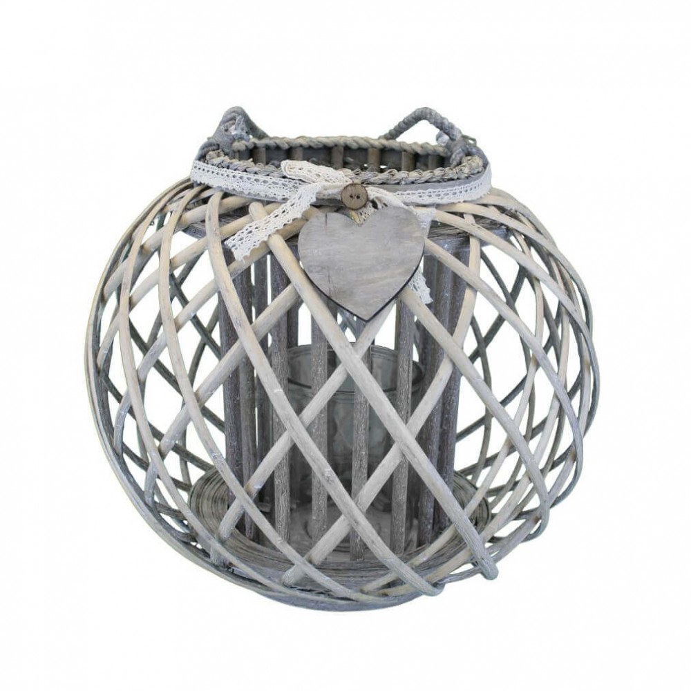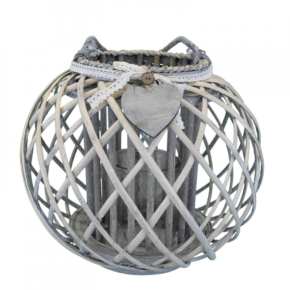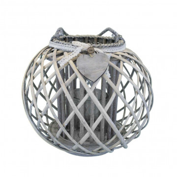 Lanterna GRIGIA in vimini e vetro con nastro in pizzo e decoro a cuore Dimensioni: cm Top Ø 20 x 36 h-Centrale Ø 44 x 36 h-Vetro Ø 13 x 17 h