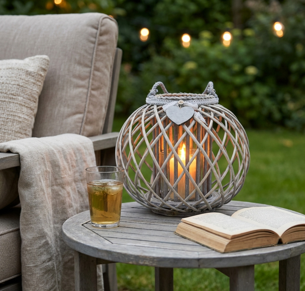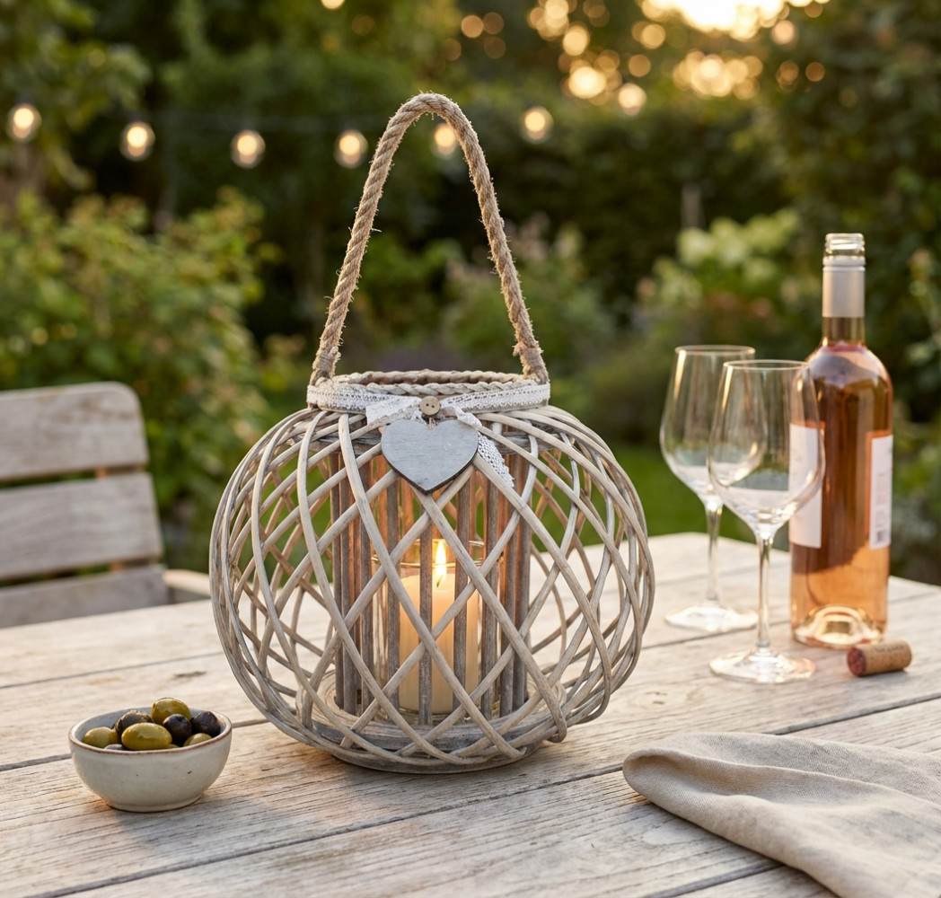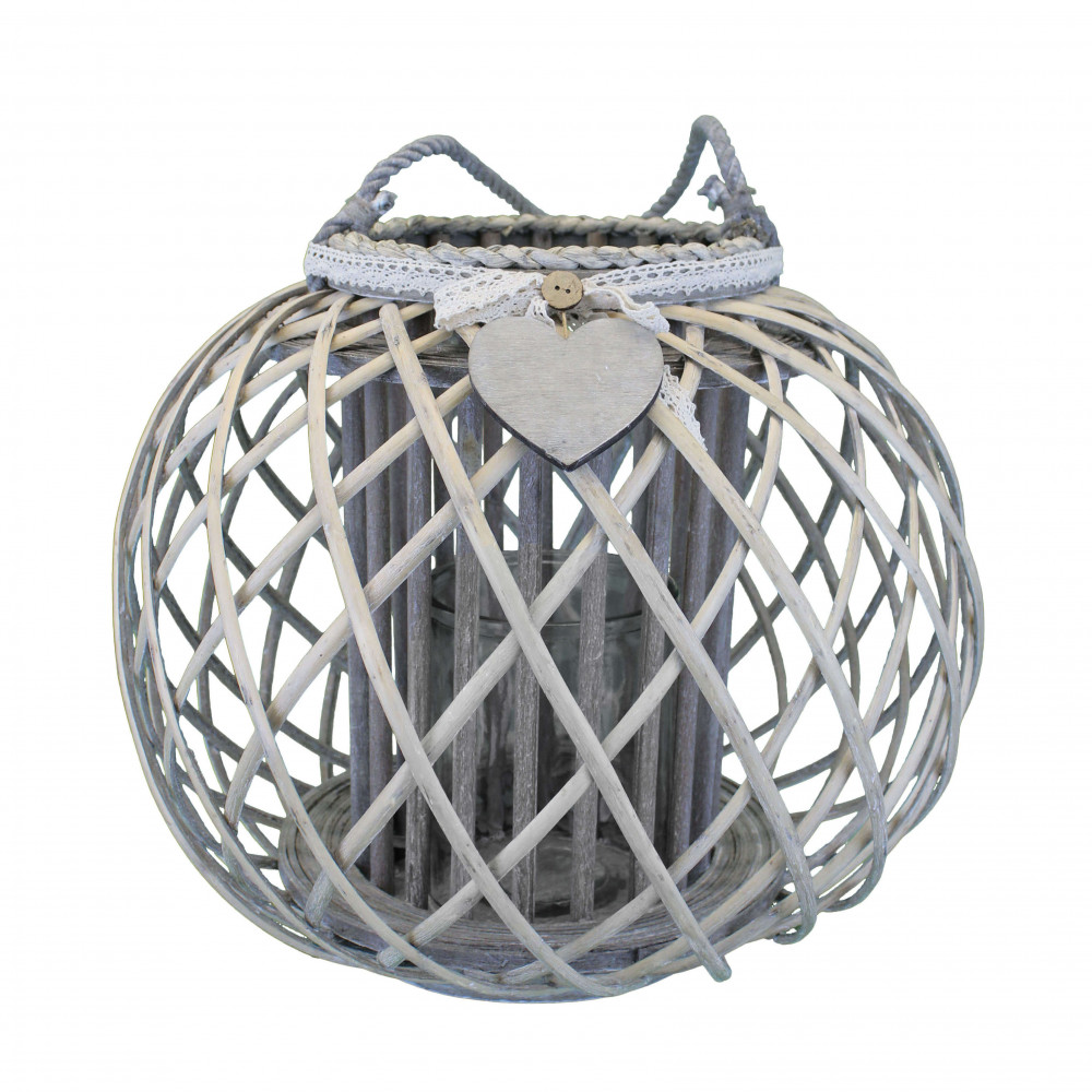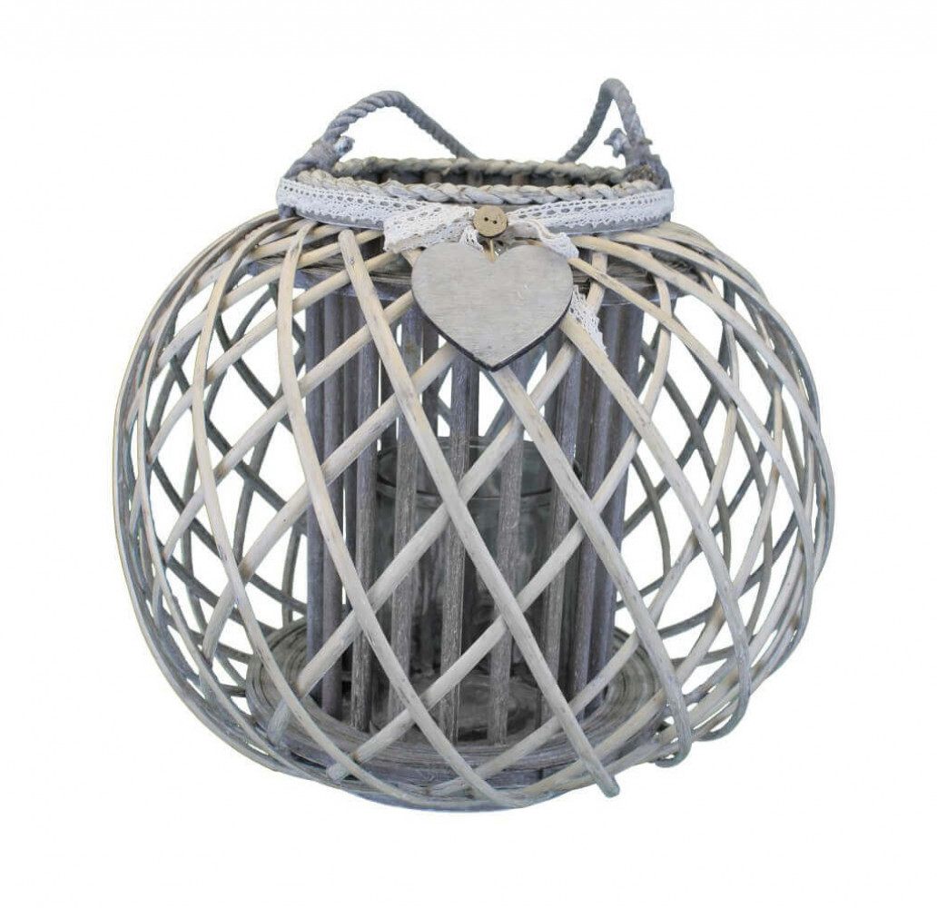 Lanterna GRIGIA in vimini e vetro con nastro in pizzo e decoro a cuore Dimensioni: cm Top Ø 20 x 32 h-Centrale Ø 40 x 32 h-Vetro Ø 12,5 x 15 h
