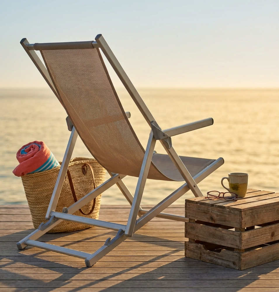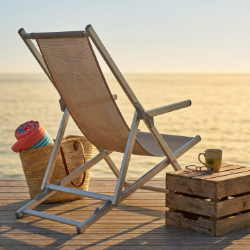 Disponibile BIANCO, BLU, BEIGE MELANGE o GRIGIO MELANGE struttura in alluminio, portata max 100 kg, tessuto textilene Dimensioni: cm 98 x 67,5 x 106 h