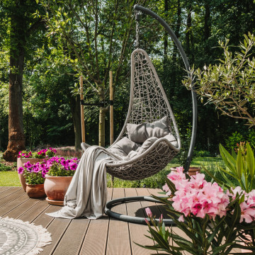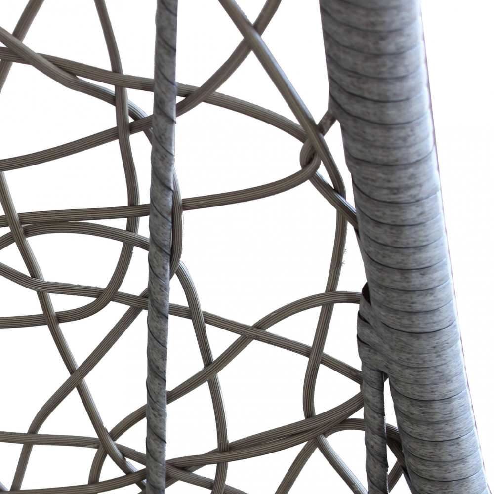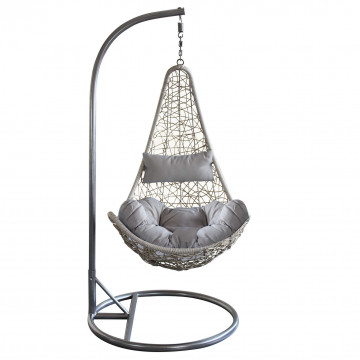 Struttura in metallo tortora opaco seduta in wicker GRIGIO o BIANCO o NATURALE tubi in metallo 42 x 2,5 mm base 42 x1,5 mm cuscino poliestere in tinta Dimensioni: Struttura Ø 95 x 195h seduta 80 x 70 x 122