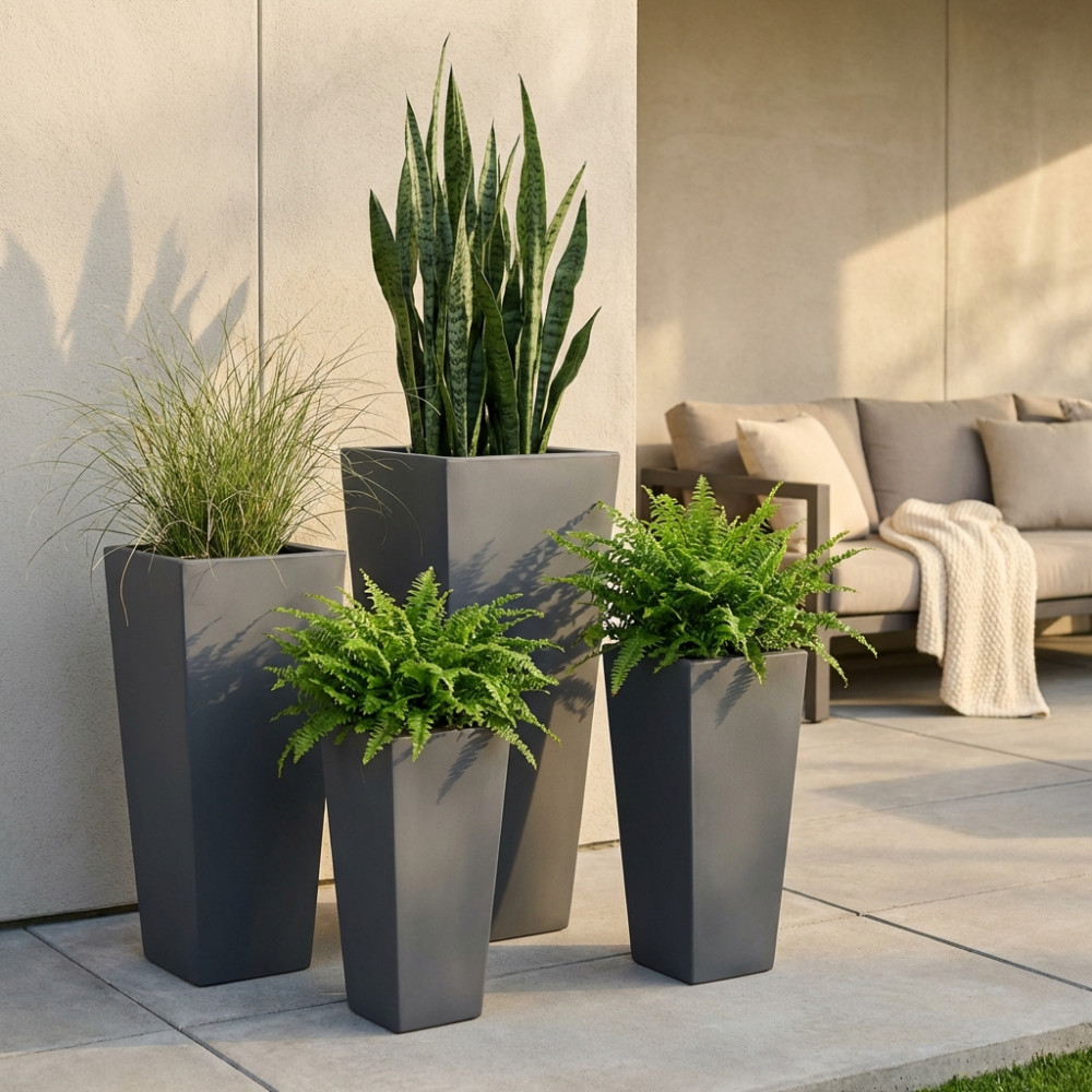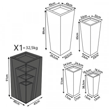 - Dati Tecnici Set di 4 vasi in fibra di sintetica color MARRONE, GRIGIO o BEIGE Dimensioni: G.43x43x89/M.32x32x65/P.24,5x24,5x50,5/xS.18,5x18,5x38,5