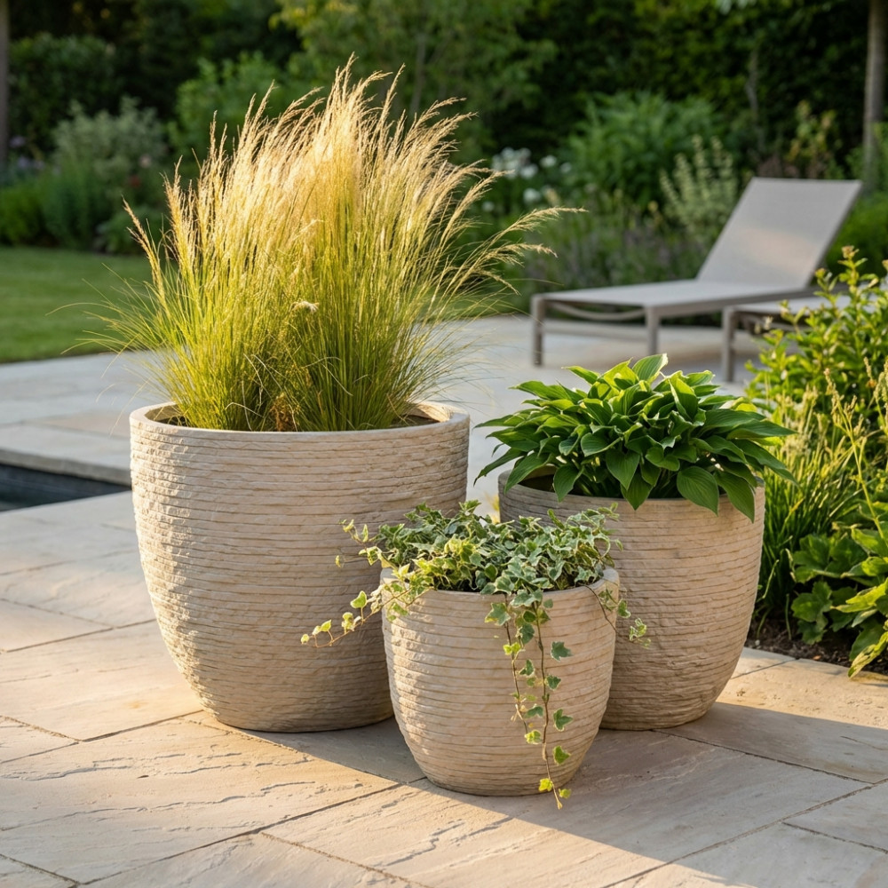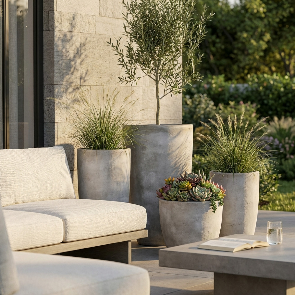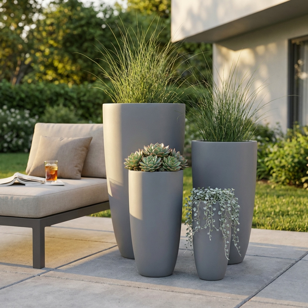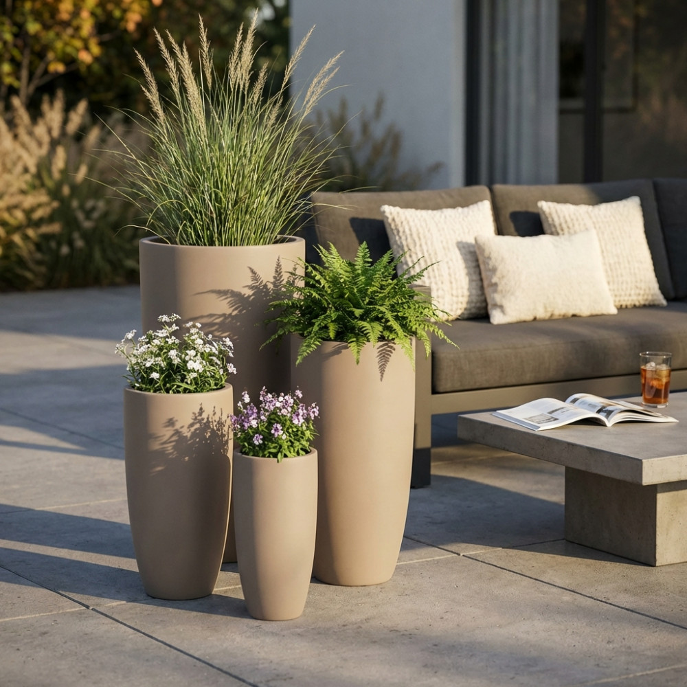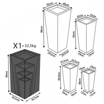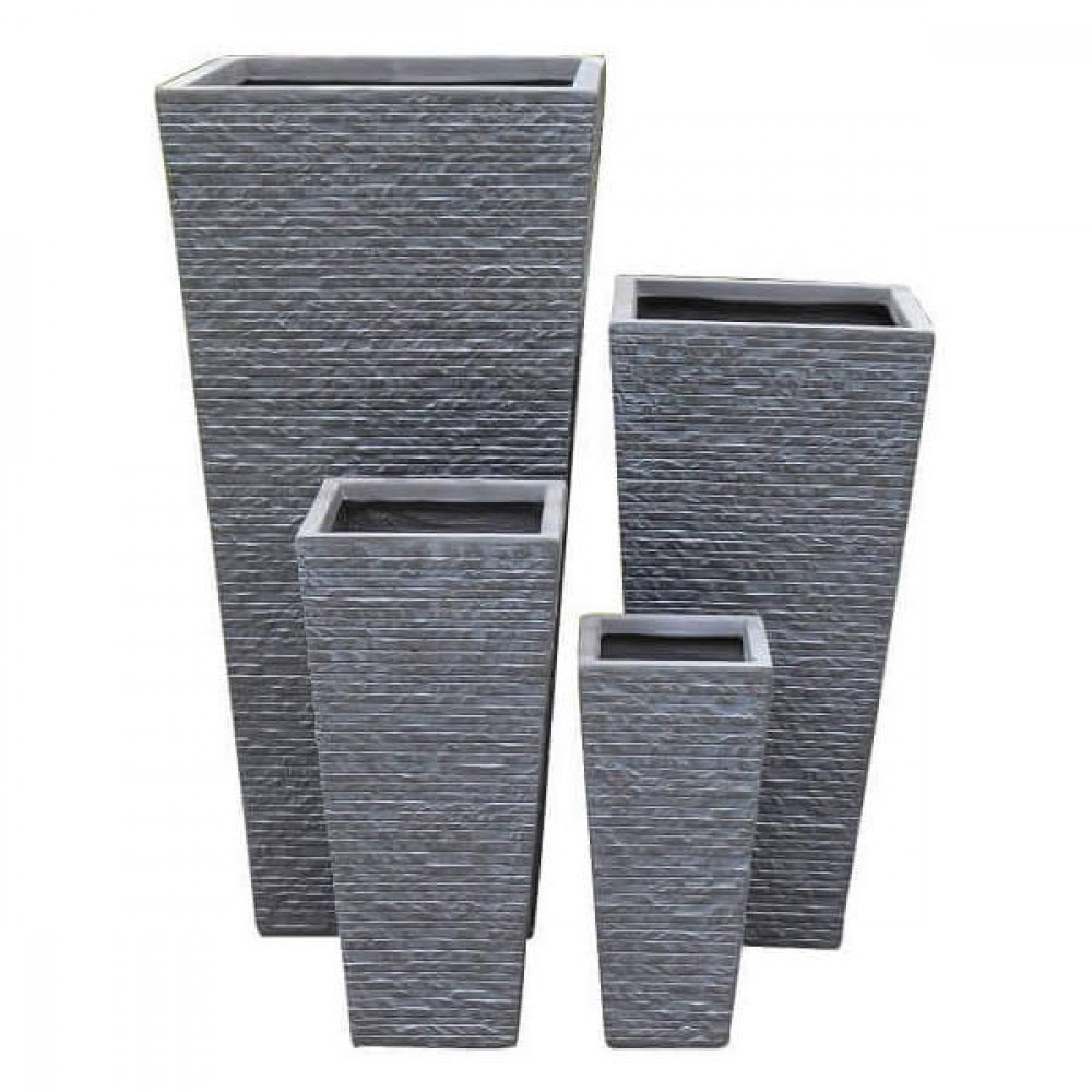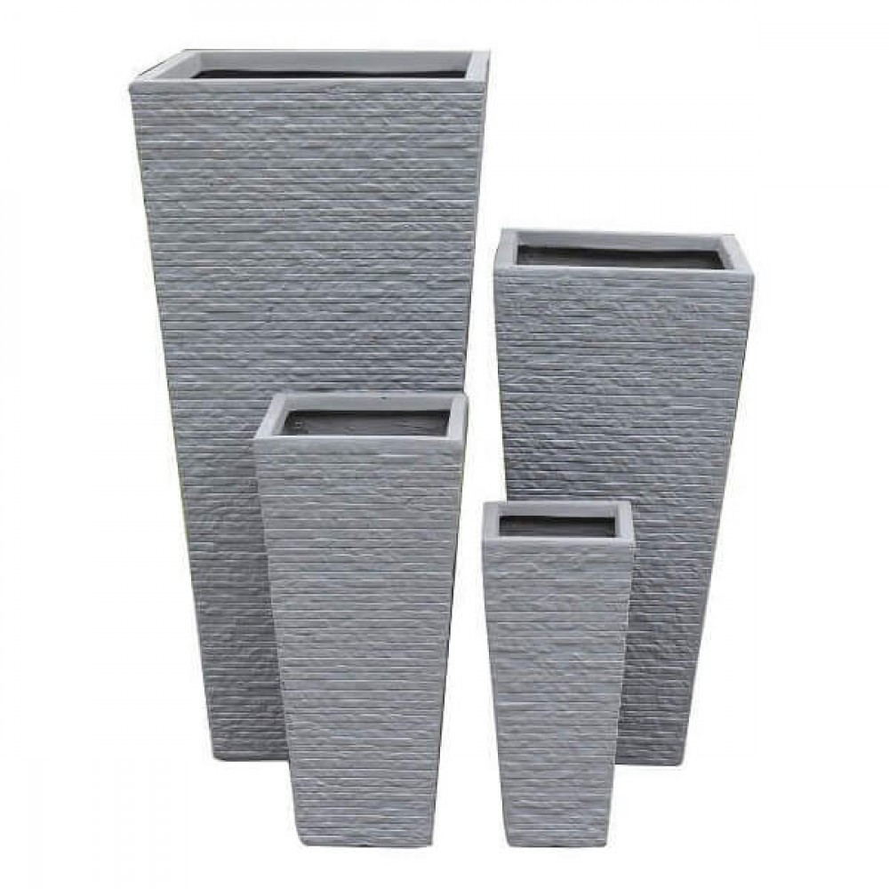 Set di 4 vasi in fibra di sintetica color GRIGIO CHIARO, GRIGIO SCURO o BEIGE Dimensioni: G.42x42x88/M.32x32x65,5/P.23,5x23,5x50,5/xS.18x18x38