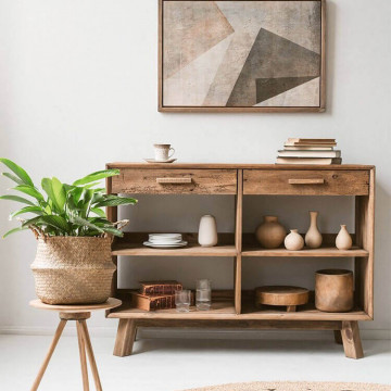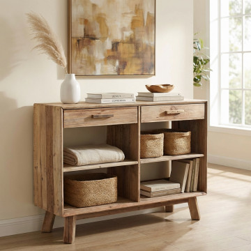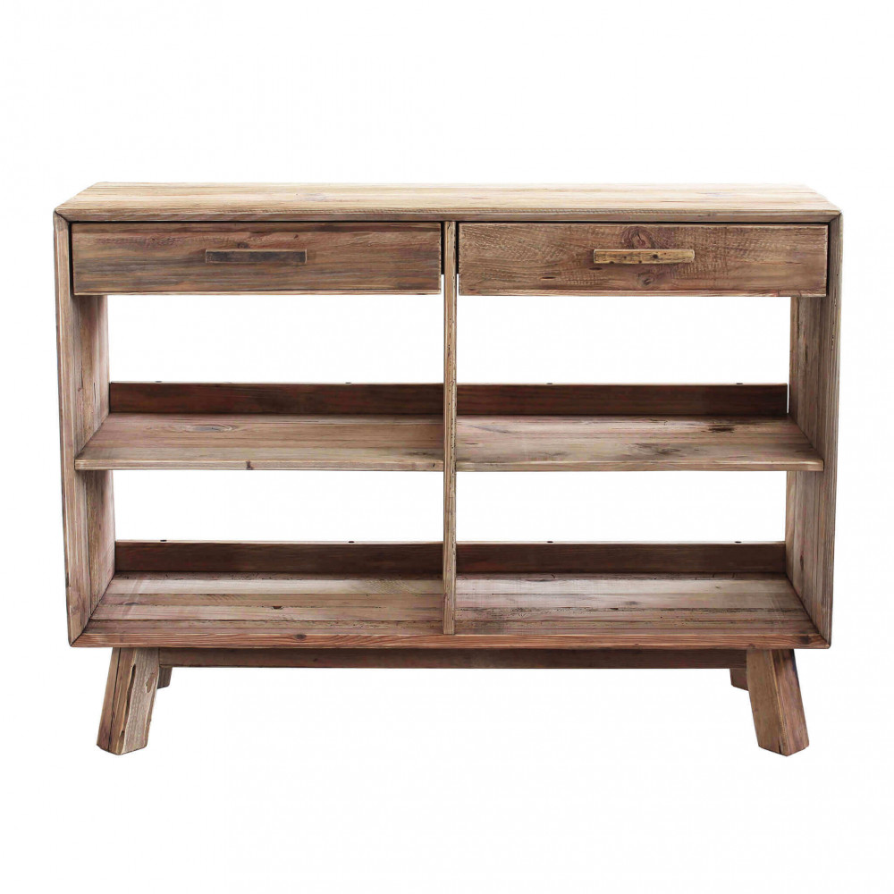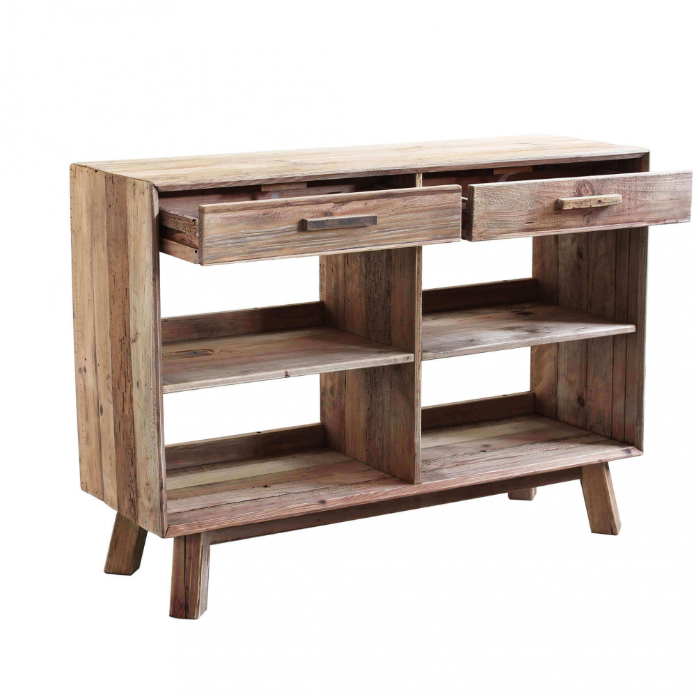 - Dati Tecnici Mobile con 2 cassetti e 4 ripiani in legno di pino riciclato Dimensioni: cm 117,8 x 40 x 85 h