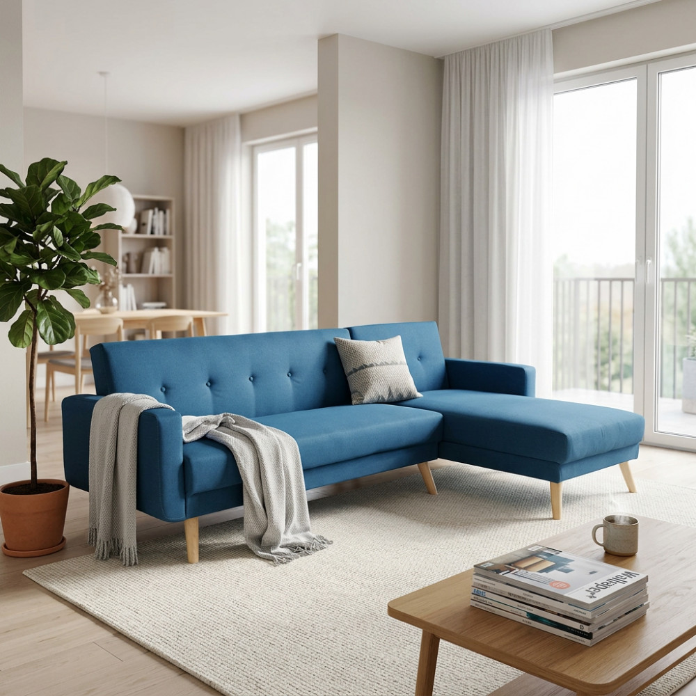 - Dati Tecnici Divano Letto BLU MELANGE struttura in metallo e legno Dimensioni: D.176x84x84/DL.176x105x45/S.74x157x84/SL.74x178x45