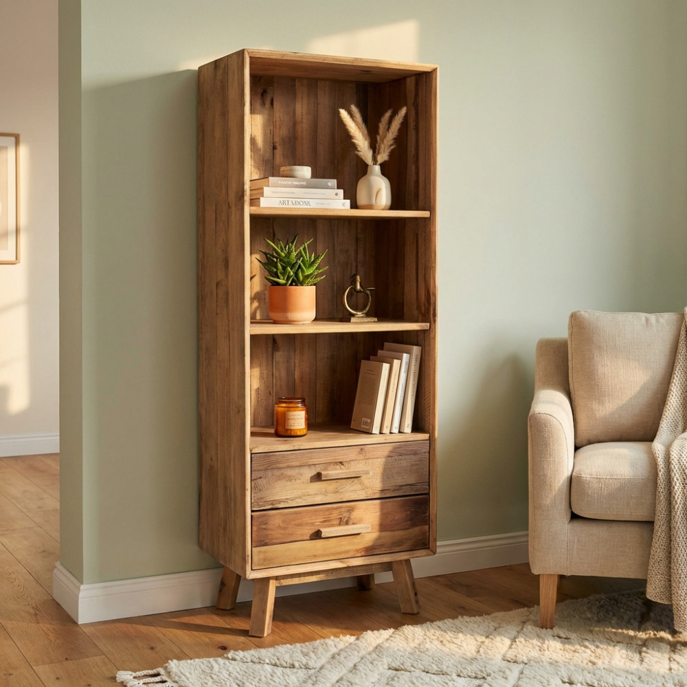- Dati Tecnici Libreria con 2 cassetti e 3 ripiani in legno di pino riciclato Dimensioni: cm 60 x 40 x 160 h