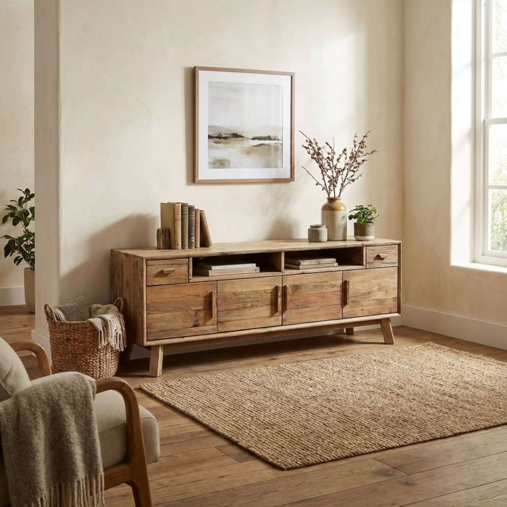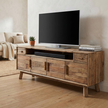 - Dati Tecnici Porta TV con 2 cassetti, 4 ante e 2 ripiani in legno di pino riciclato Dimensioni: cm 180 x 48 x 65 h