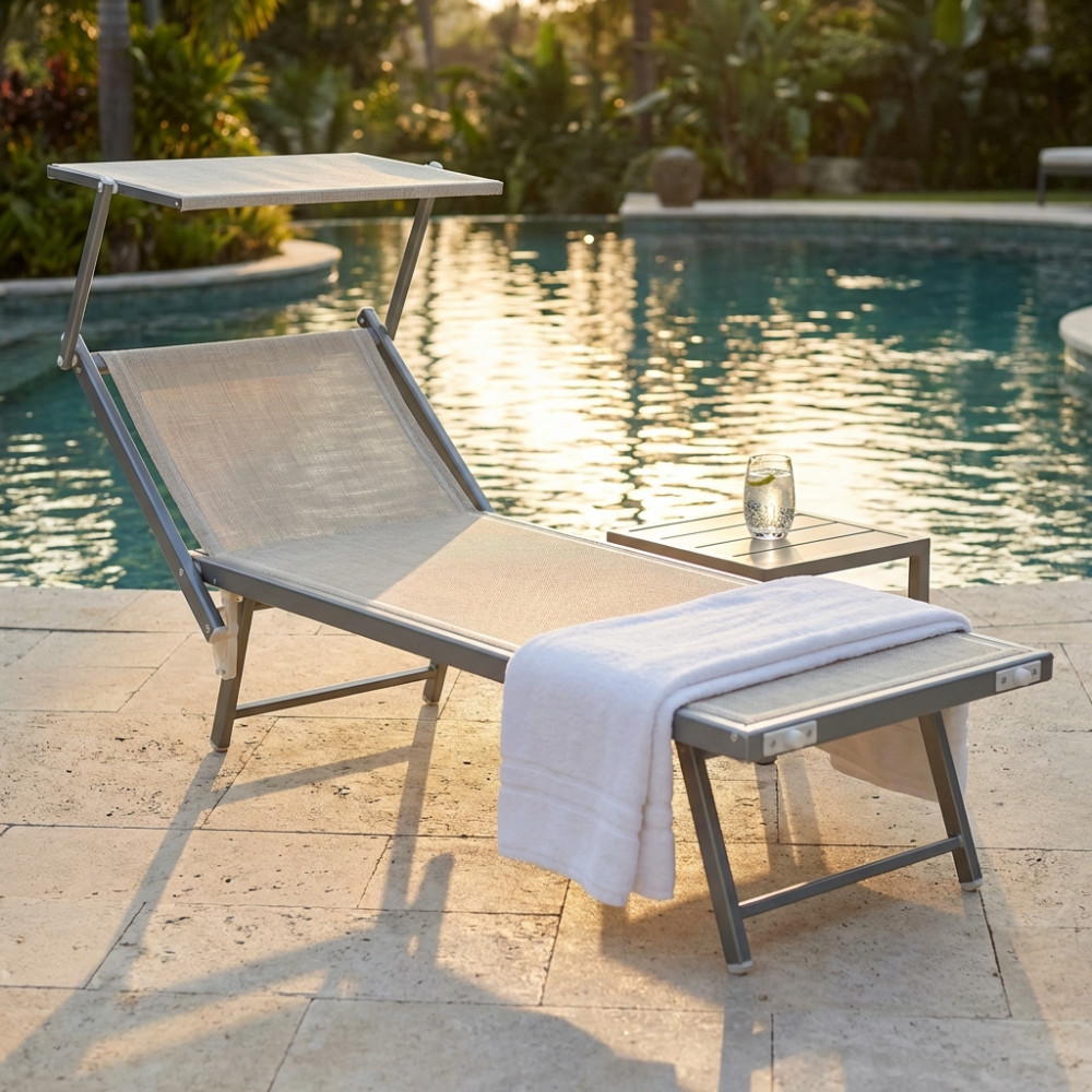 Disponibile BLU, BIANCO, BEIGE MELANGE struttura in alluminio 43x42 mm regolabile in 2 posizioni portata max 120 kg, tessuto in textilene 2 x 1 Dimensioni: cm 183/189 x 61 x 38 h