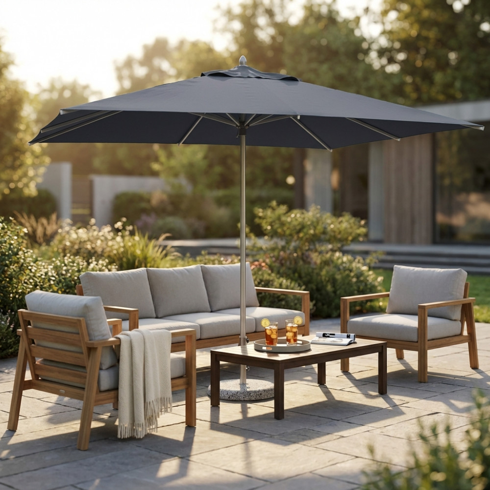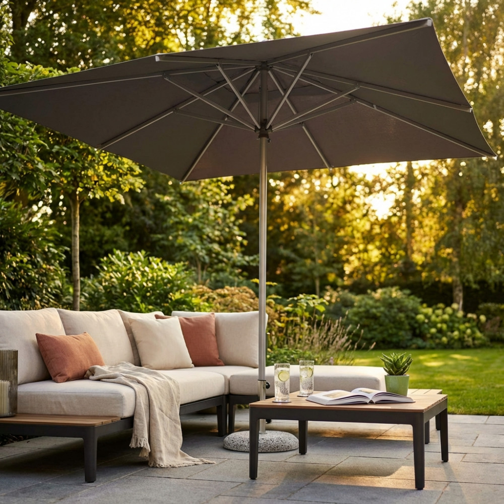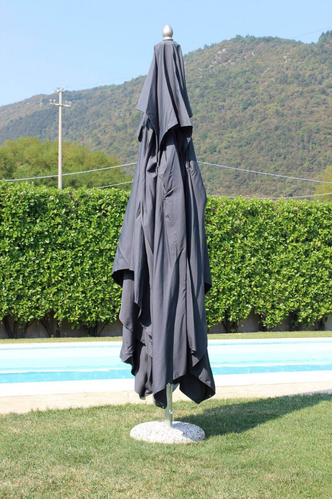 Telo in poliestere GRIGIO CHIARO o SCURO 270 gr con mantovana palo in alluminio Ø 48 anodizzato finitura acciaio spazzolato noce in alluminio 110 mm 8 stecche in alluminio 20 x 30 mm Dimensioni: m 3 x 3