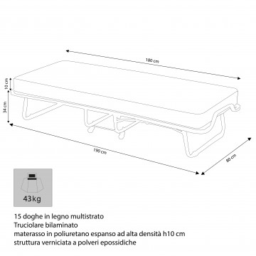 Rete con 15 doghe in legno multistrato, materasso 10 cm Verniciato a polveri epossodiche Dimensioni: B.80x190x34 M.80x180