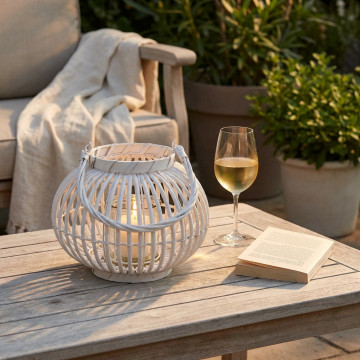 - Dati Tecnici Lanterna BIANCA in vimini e vetro Dimensioni: cmØ24/topØ14x19h/vetroØ10x10h