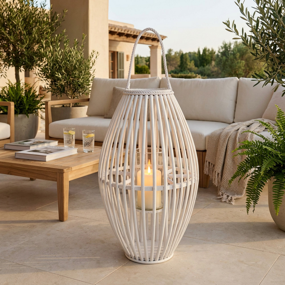 - Dati Tecnici Lanterna BIANCA in vimini e vetro Dimensioni: cmØ39/topØ16,5x90h/vetroØ13x17h