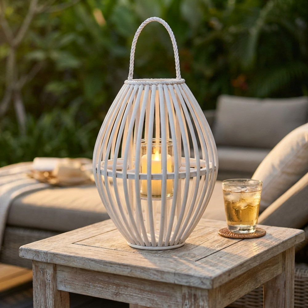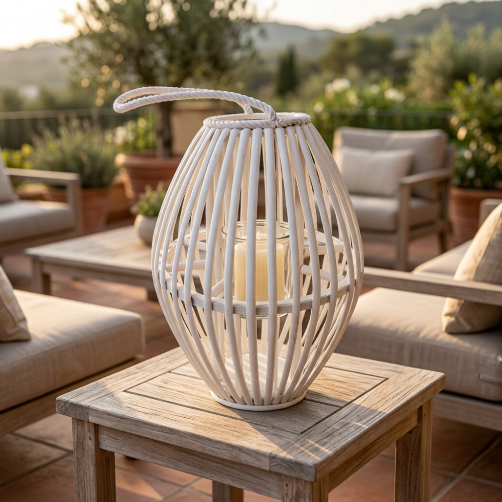 - Dati Tecnici Lanterna BIANCA in vimini e vetro Dimensioni: cmØ30/topØ12,5x40h/vetroØ10x12h