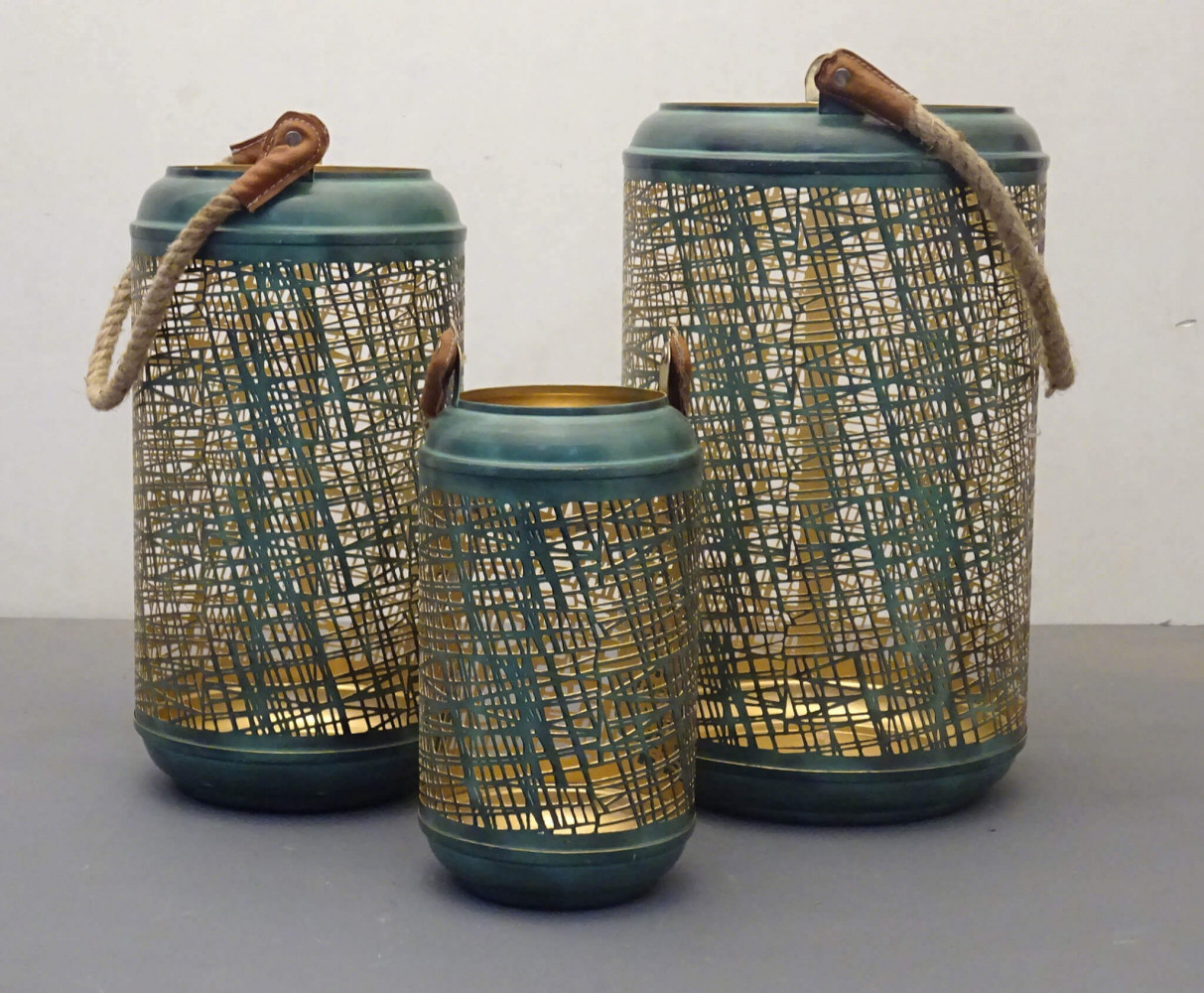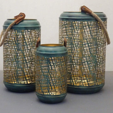 Lanterna in metallo con decoro NERA o VERDE con interno ORO e con manico in corda di juta Dimensioni: G.Ø42x25/M.Ø38x20/P.Ø27x15
