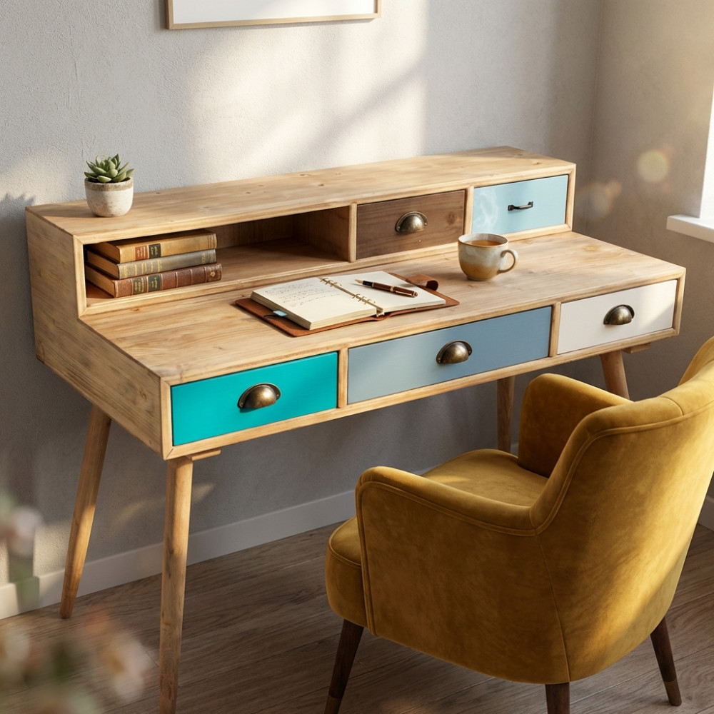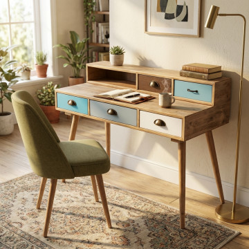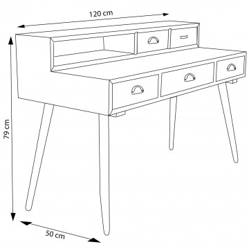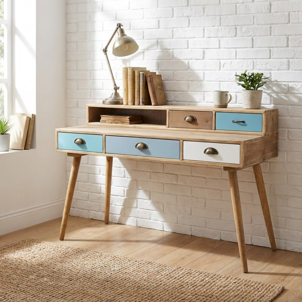 - Dati Tecnici Struttura in MDF, gambe in legno di pino, top colore NATURALE 1 ripiano e 5 cassetti colorati Dimensioni: cm 120 x 50 x 79 h