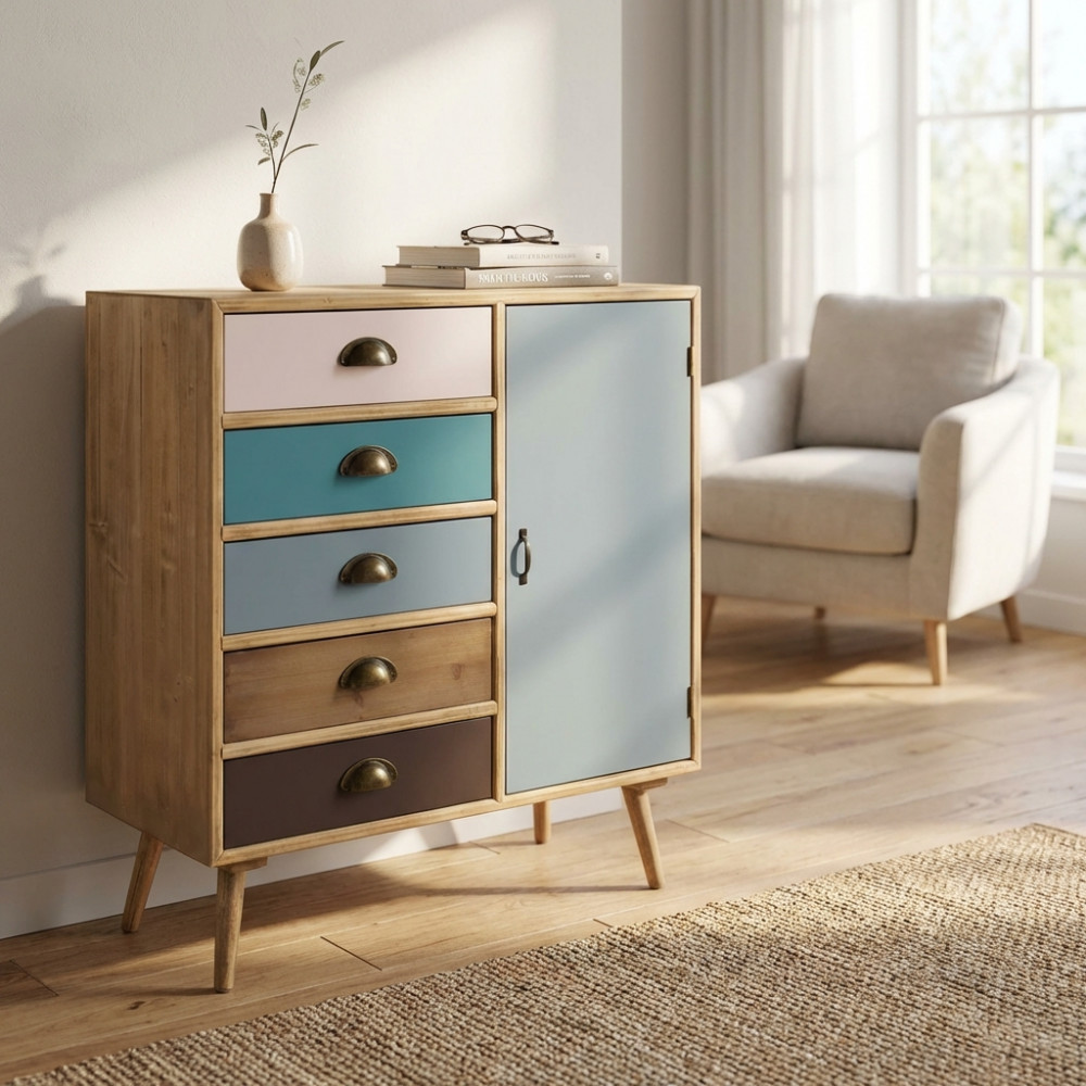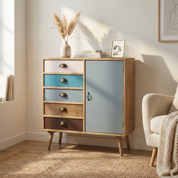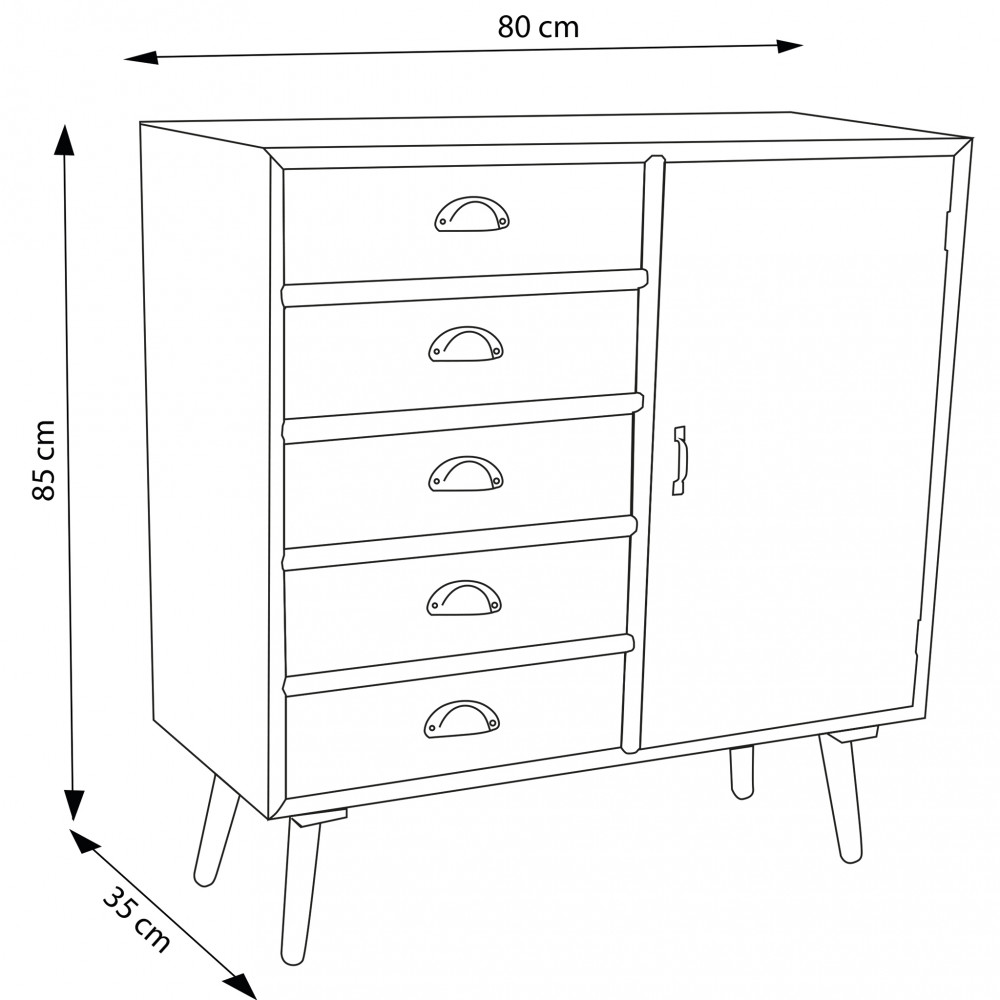 - Dati Tecnici Struttura in MDF, gambe in legno di pino, top colore NATURALE 1 anta e 5 cassetti colorati Dimensioni: cm 80 x 35 x 85 h