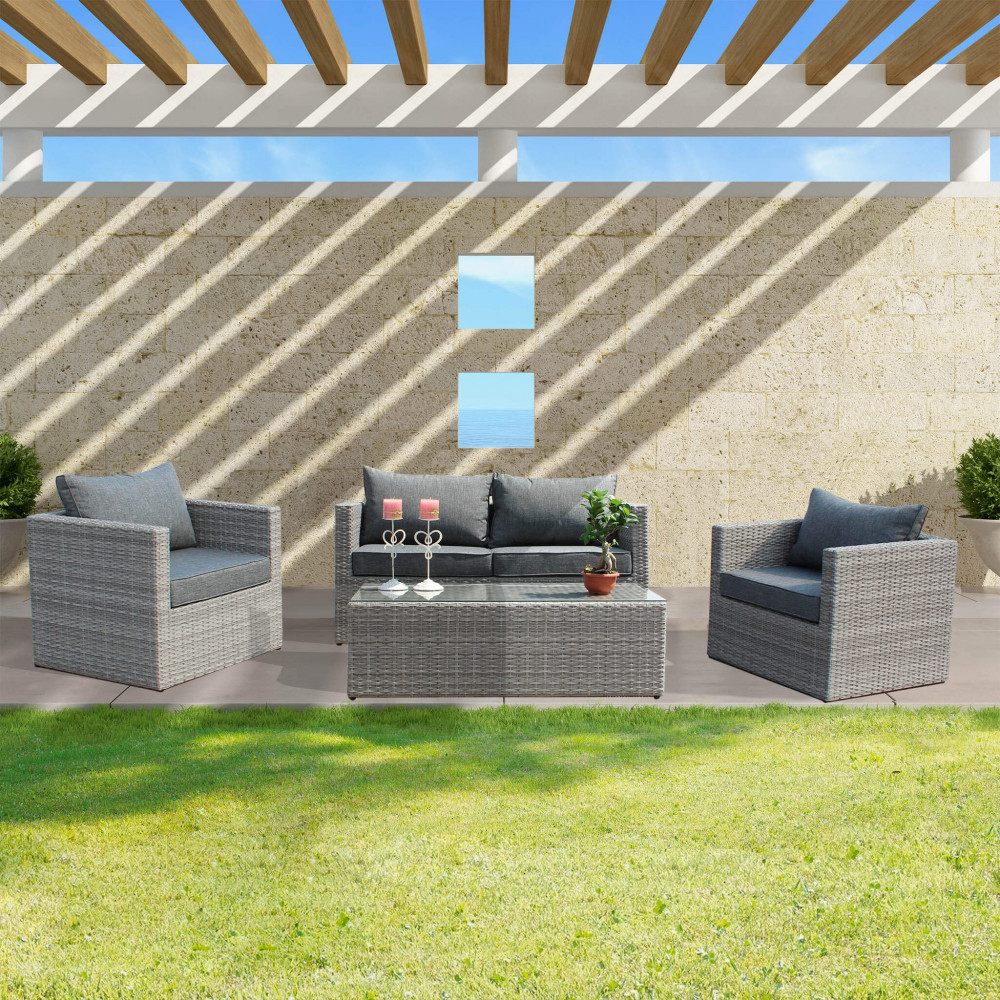 Struttura in alluminio, wicker GRIGIO materiale UV protection cuscini 10 cm, vetro temperato 5 mm Dimensioni: D.144x72x64/P.80x72x64/T.109x55x34