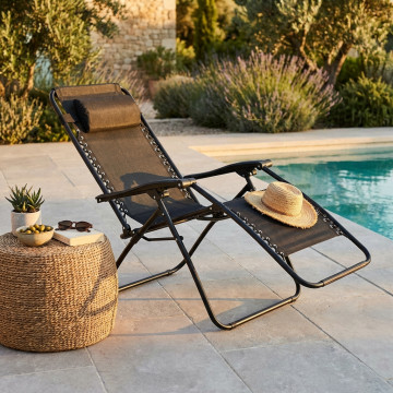 Dati Tecnici Disponibile BEIGE, BLU, AZZURRO, GRIGIO SCURO, NERO, o VERDE SCURO struttura in acciaio ANTRACITE Ø 22 x 1 mm, tessuto in textilene 2 x 1, portata max 110 kg. Dimensioni: cm 88 x 65 x 110 h