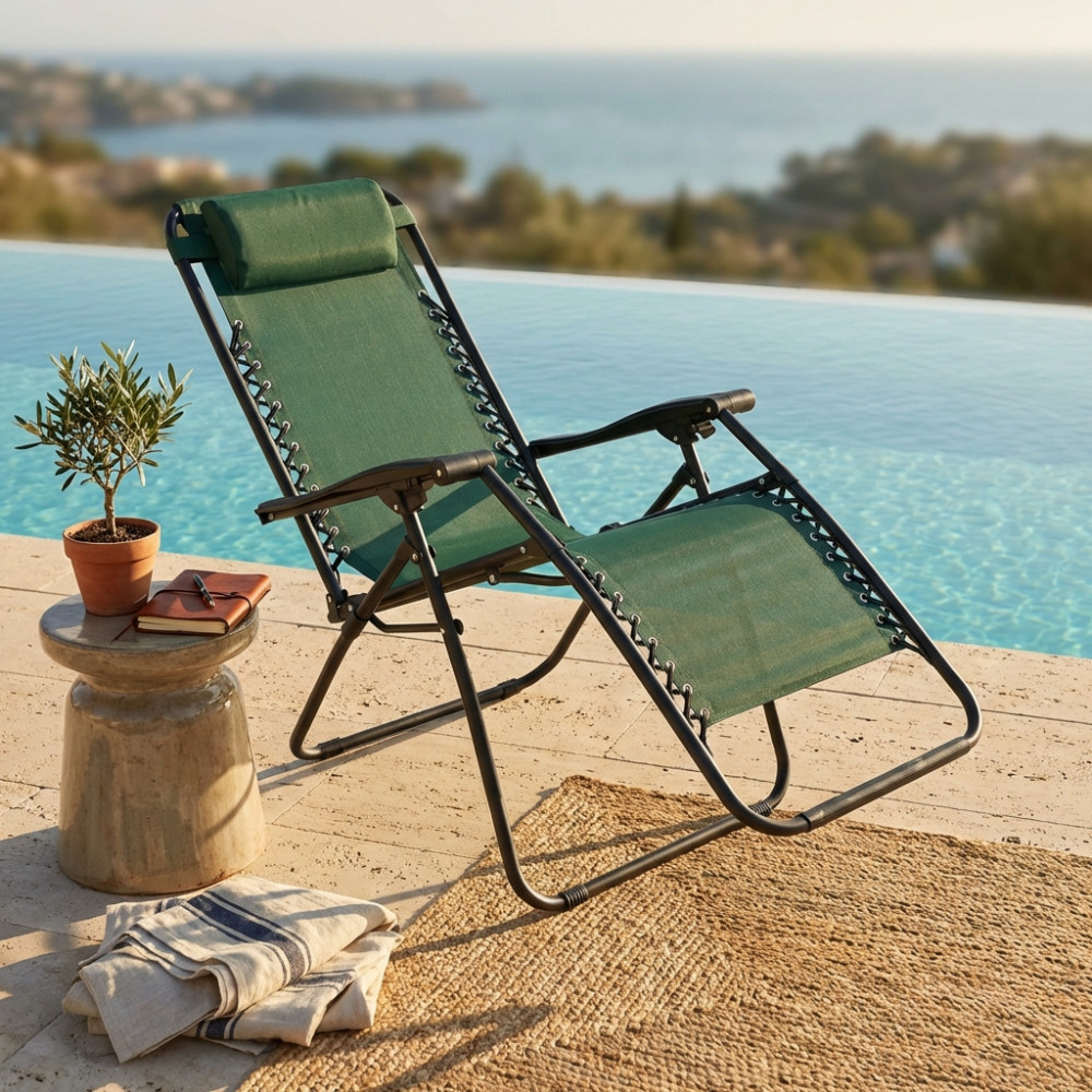 Dati Tecnici Disponibile BEIGE, BLU, AZZURRO, GRIGIO SCURO, NERO, o VERDE SCURO struttura in acciaio ANTRACITE Ø 22 x 1 mm, tessuto in textilene 2 x 1, portata max 110 kg. Dimensioni: cm 88 x 65 x 110 h