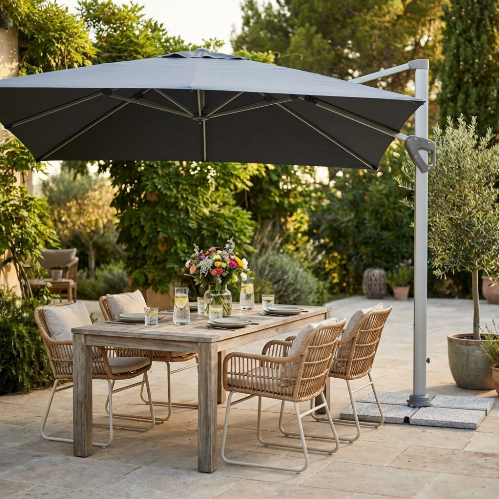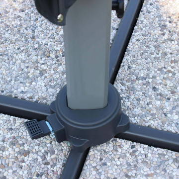 Telo in poliestere GRIGIO 250 gr con antivento palo girevole in alluminio 58x88 e 40x25 mm 8 stecche alluminio 14 x 24 mm, base a crociera Dimensioni: m 3 x 3