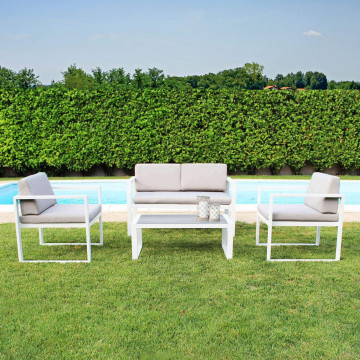 Struttura in alluminio verniciato BIANCO, TORTORA, TAUPE o ANTRACITE, cuscini in poliestere vetro tavolino 5 mm Dimensioni: D.120x66x63/P.65x66x63/T.92x51,5x35