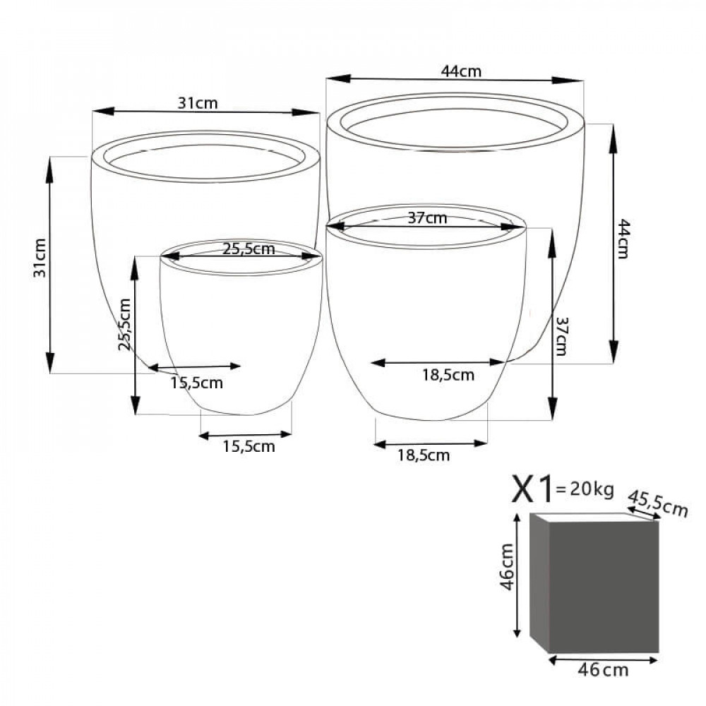 - Dati Tecnici Set di 4 vasi in fibra di sintetica GRIGIA Dimensioni: G.44x44x43/M.37x37x35/P.31x31x30,5/XS.25,5x25,5x25