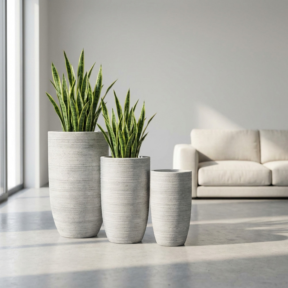 - Dati Tecnici Set di 3 vasi in fibra di sintetica GRIGIA Dimensioni: G.42,5x42,5x78,5/M.33,5x33,5x61,5/P.26,5x26,5x51