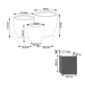 - Dati Tecnici Set di 3 vasi in fibra di sintetica GRIGIA Dimensioni: G.44x44x43,5/M.37,5x37,5x35,5/P.32x32x31,5