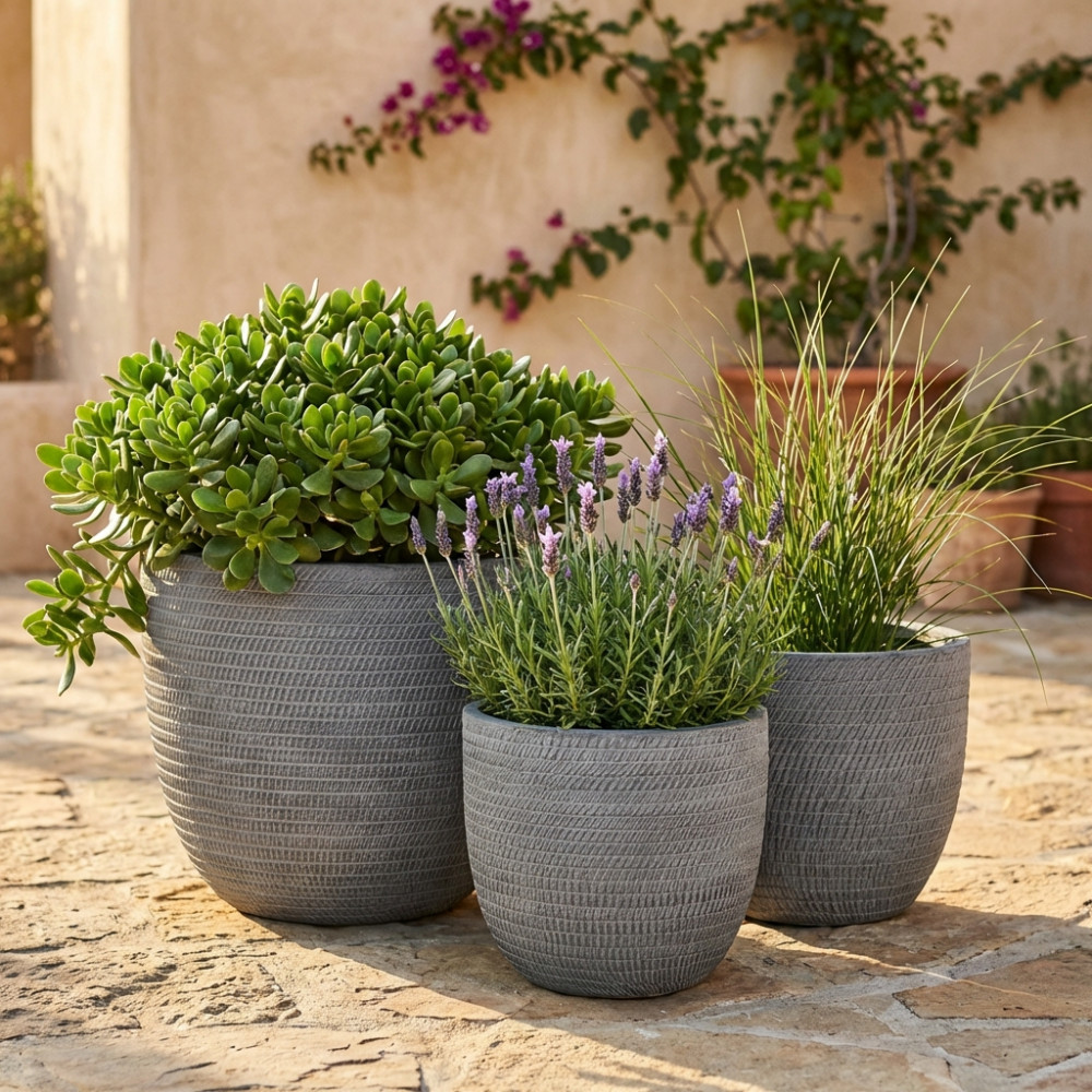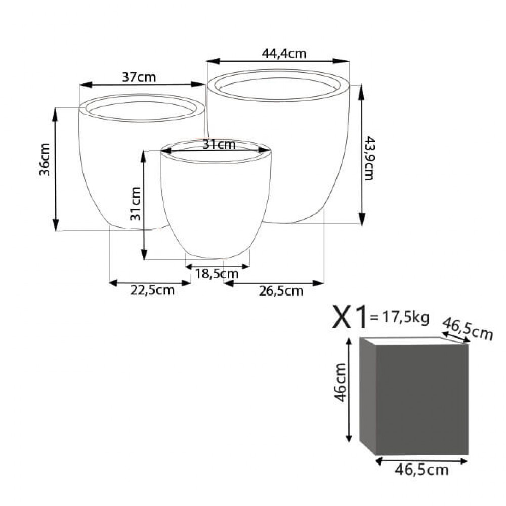 - Dati Tecnici Set di 3 vasi in fibra di sintetica GRIGIA Dimensioni: G.44,5x44,5x43/M.37,5x37,5x36/P.31,5x31,5x30,5