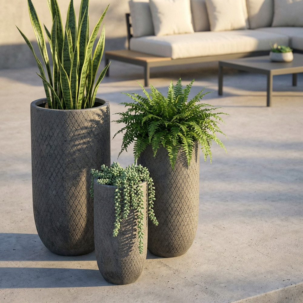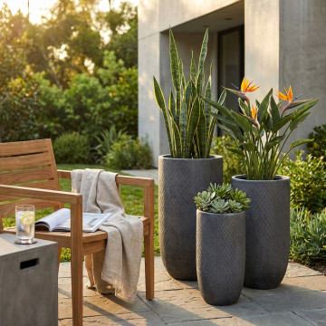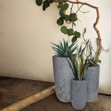 - Dati Tecnici Set di 3 vasi in fibra di sintetica GRIGIA Dimensioni: G.43,5x43,5x78,5/M.33,5x33,5x63,5/P.23,5x23,5x48,5